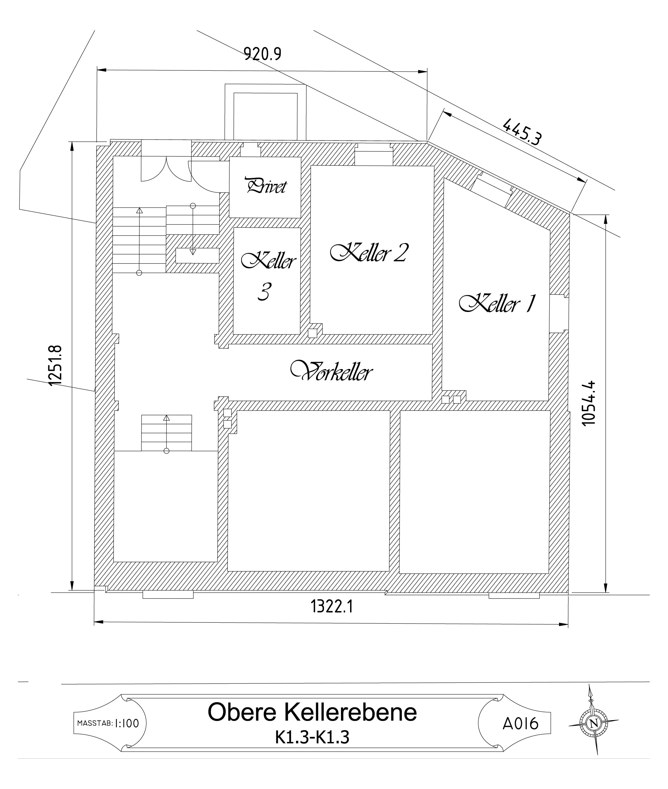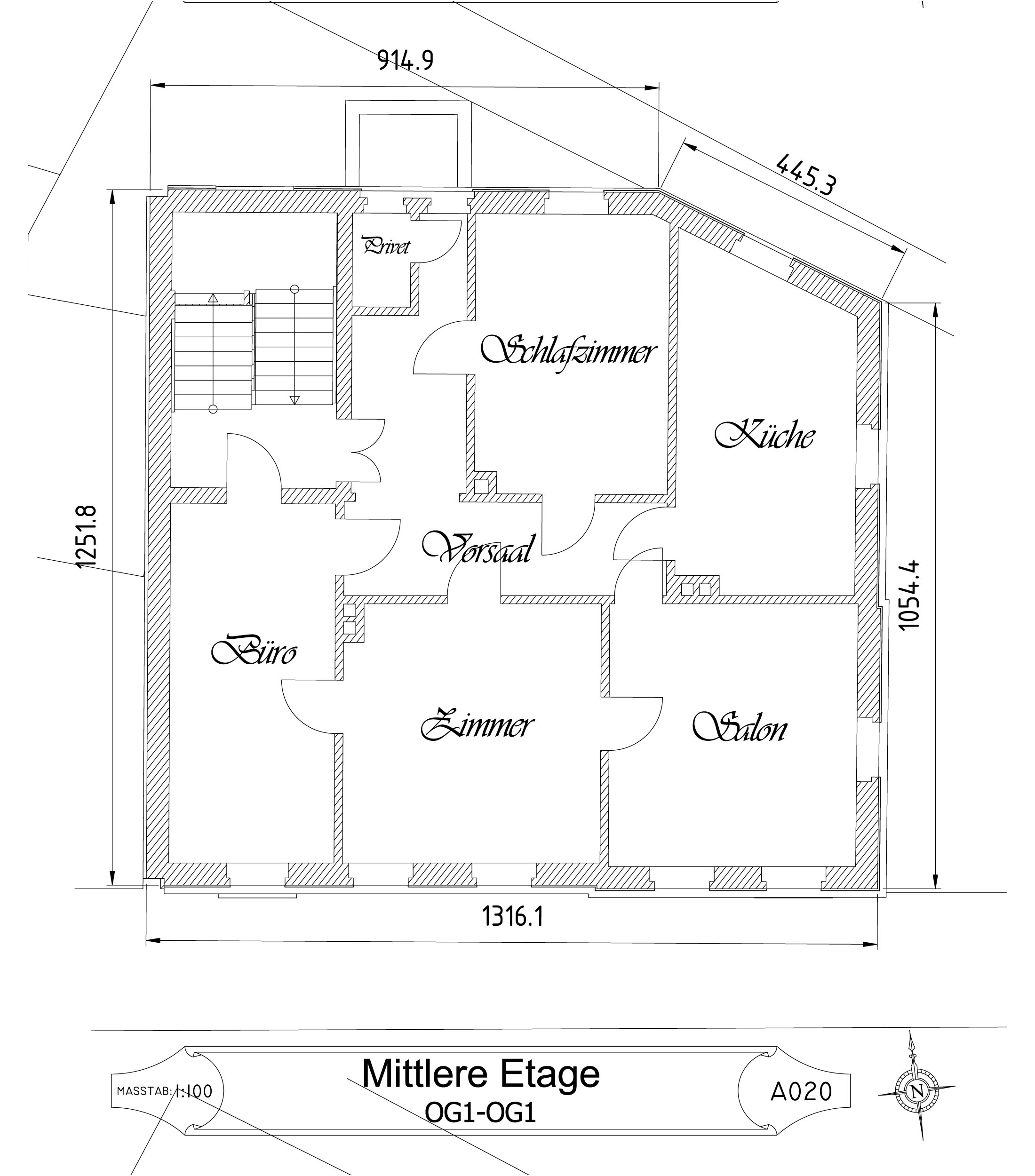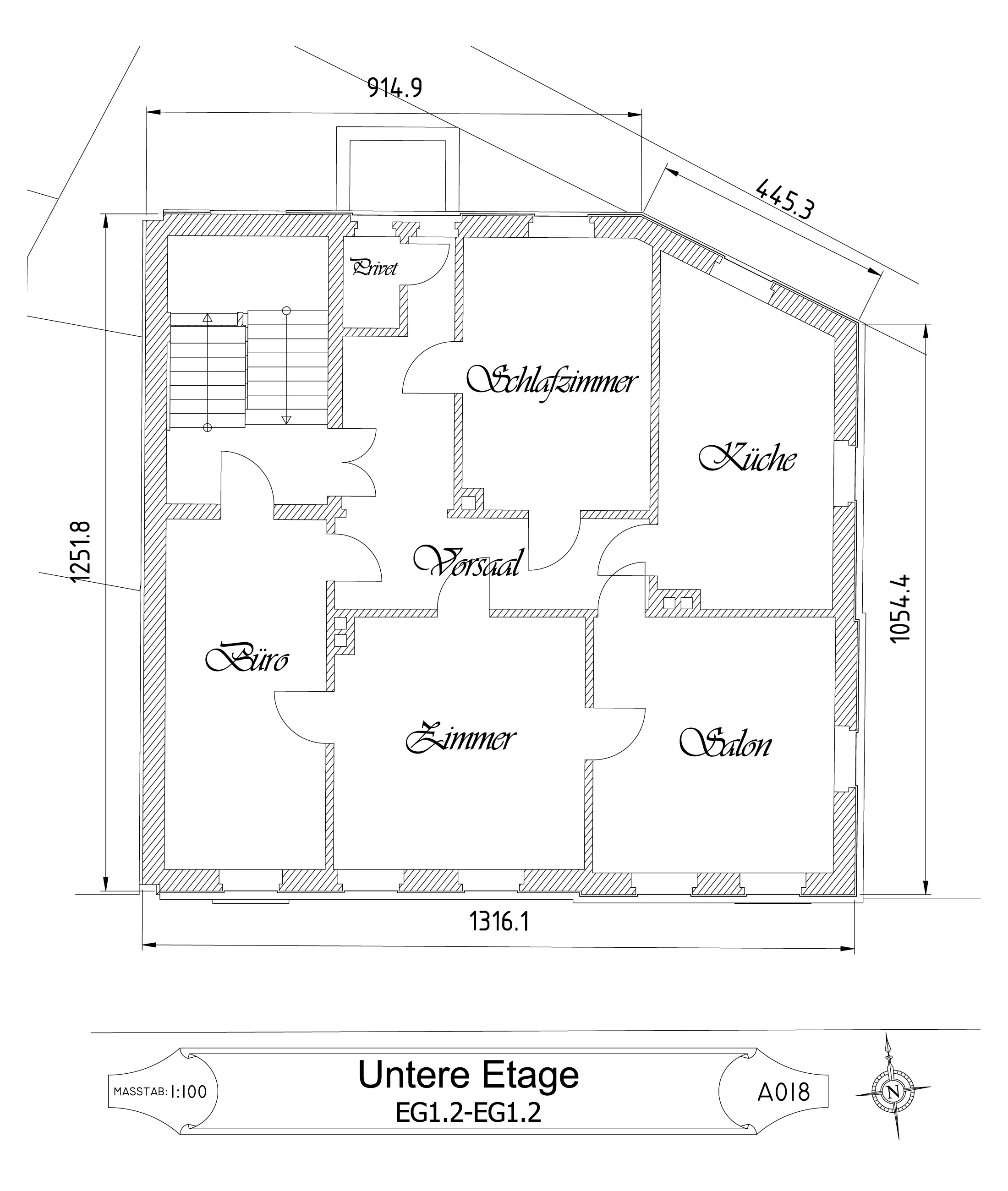 Die Vermessung der äußeren Abmessungen des Gebäudes und des Grundstücks erfolgte mit einem Baulaser. Dabei stellte sich heraus, dass die Gebäudeecken – mit Ausnahme des Treppenhauses – keine exakten 90°-Winkel bilden. Ich habe die Messungen mehrfach mit unterschiedlichen Methoden überprüft. Diese Winkel waren bereits ursprünglich im Fundament angelegt, und die präzise Arbeit der damaligen Bauhandwerker verdient großen Respekt.