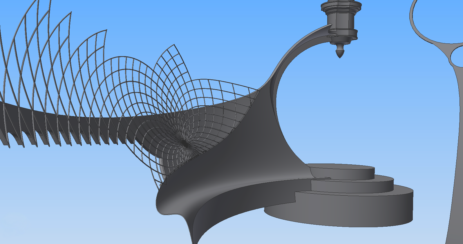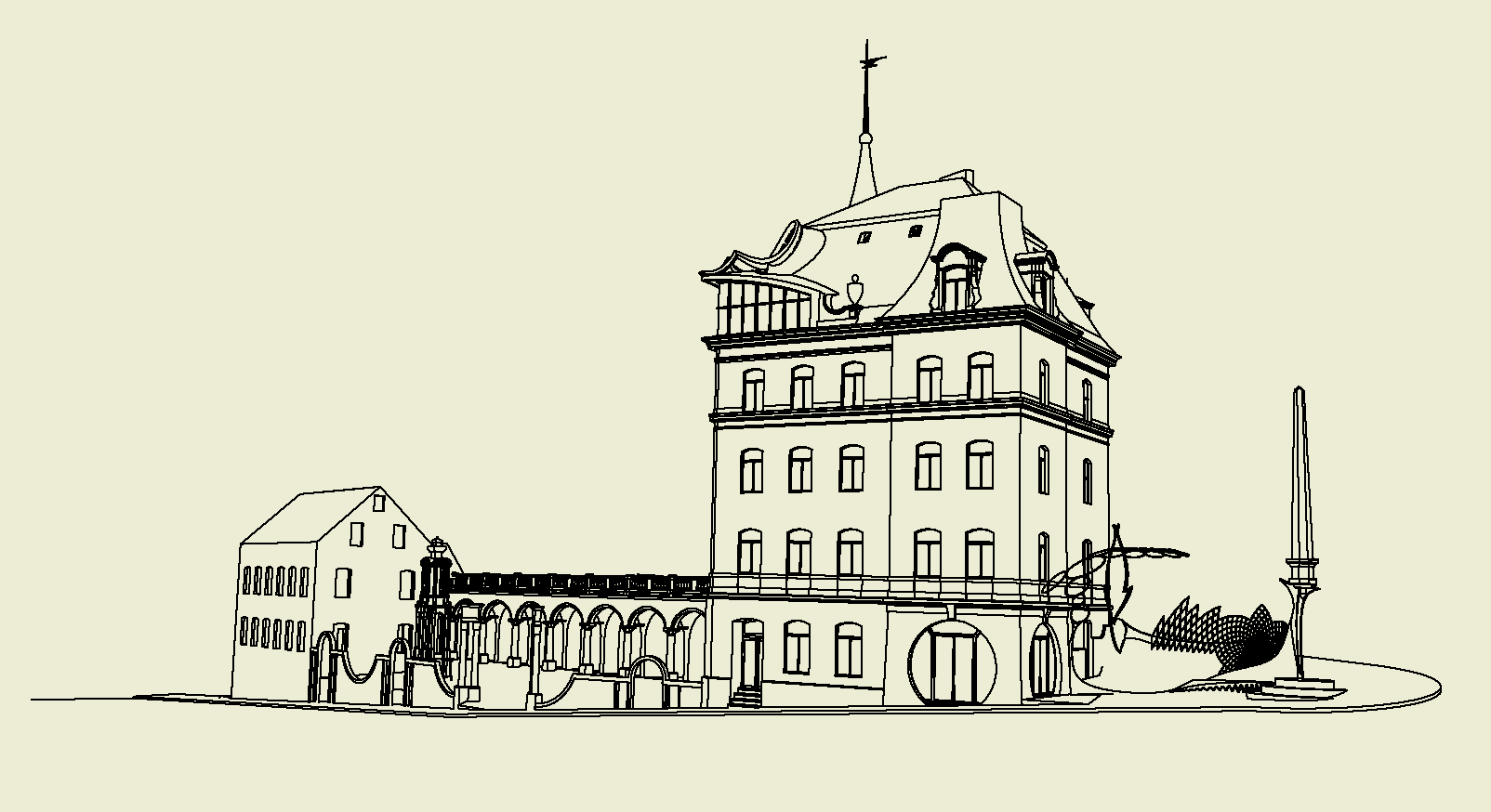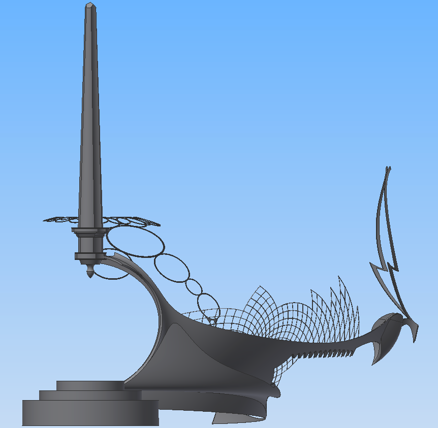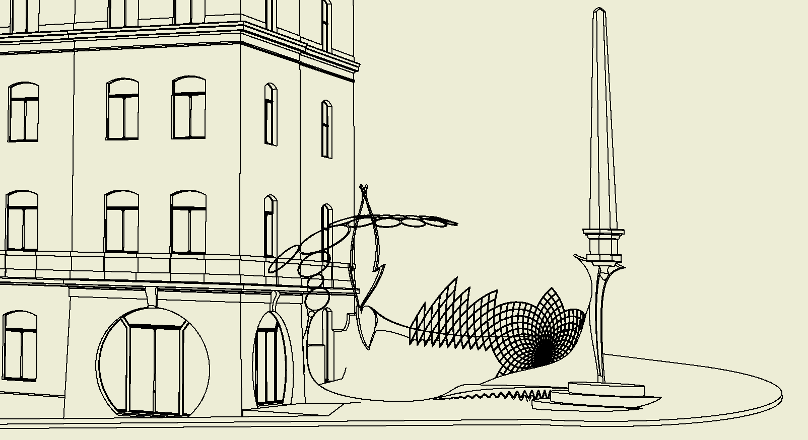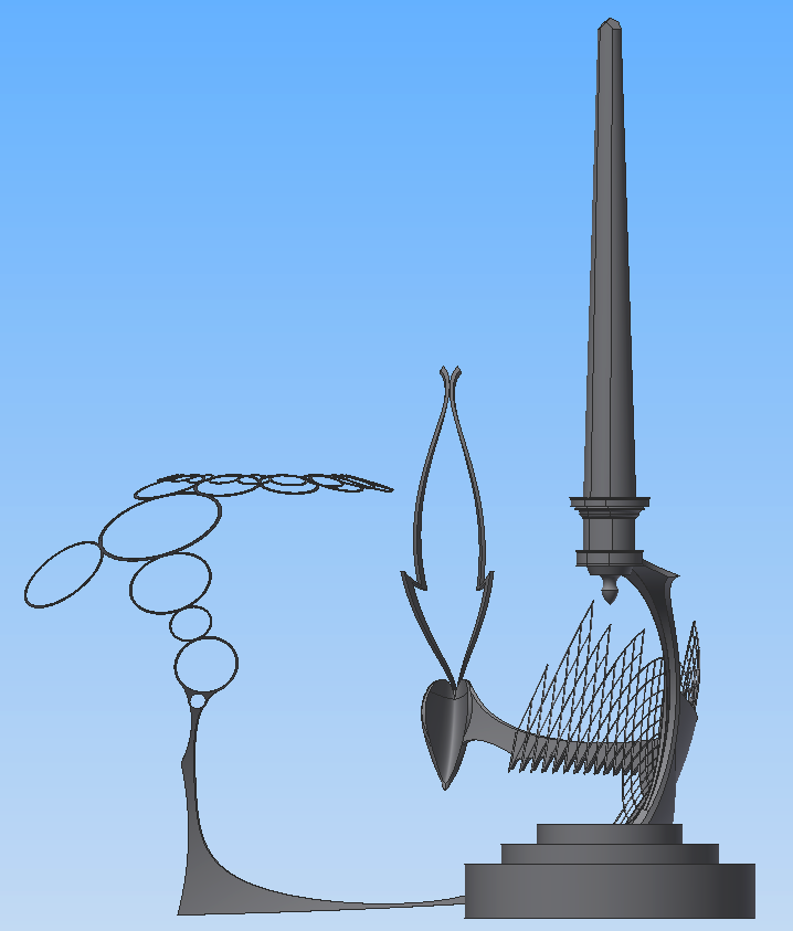 In den ursprünglichen Entwürfen war an dieser Stelle lediglich ein bronzener Obelisk vorgesehen. Um die Konstruktion leichter wirken zu lassen, sollten die Flächen des Obelisken mit leuchtenden Glasflächen versehen werden. Istvan kannte diesen Entwurf. Bei unserem letzten Treffen betrachteten wir gemeinsam die Animation dieser Komposition.