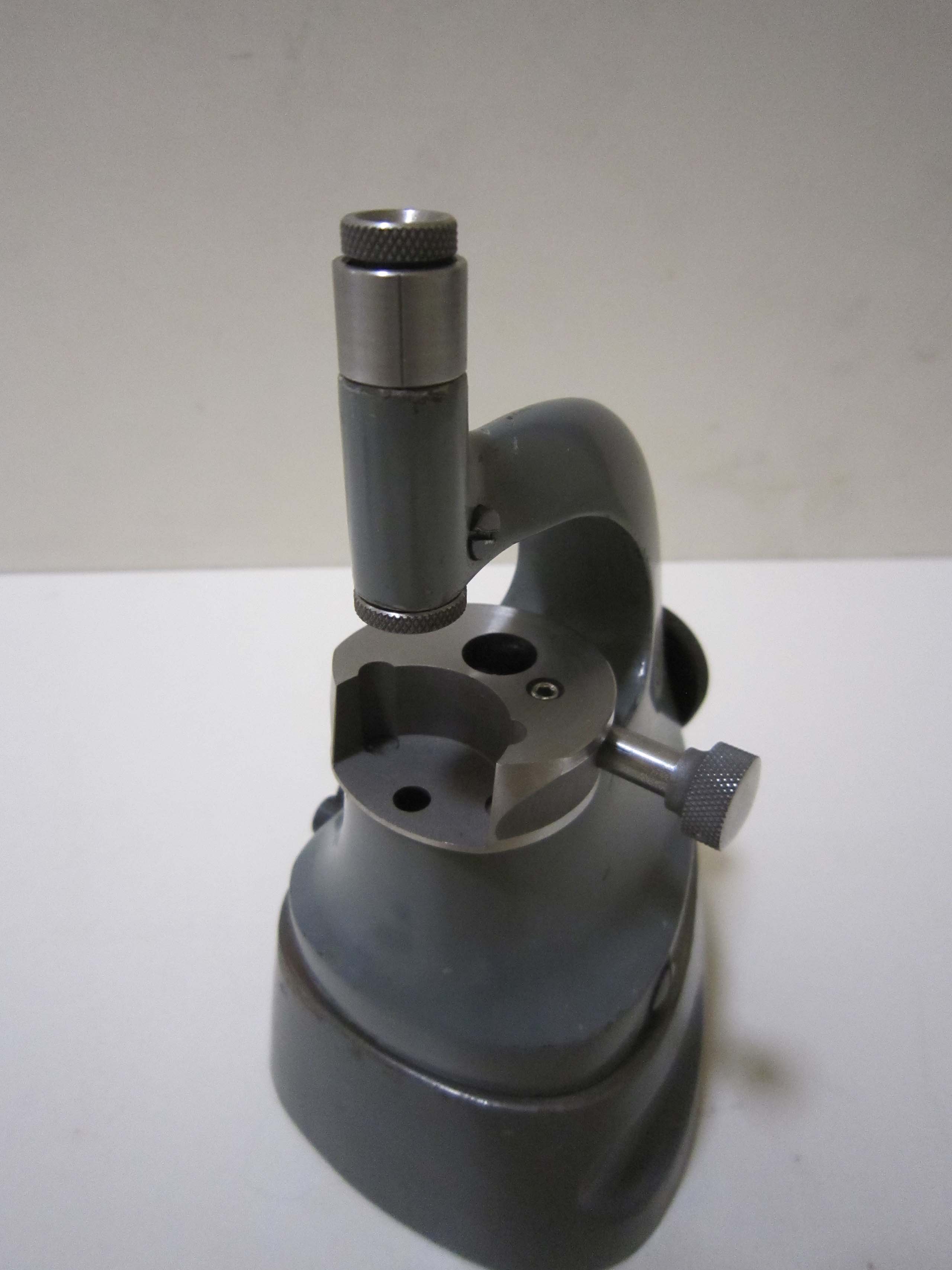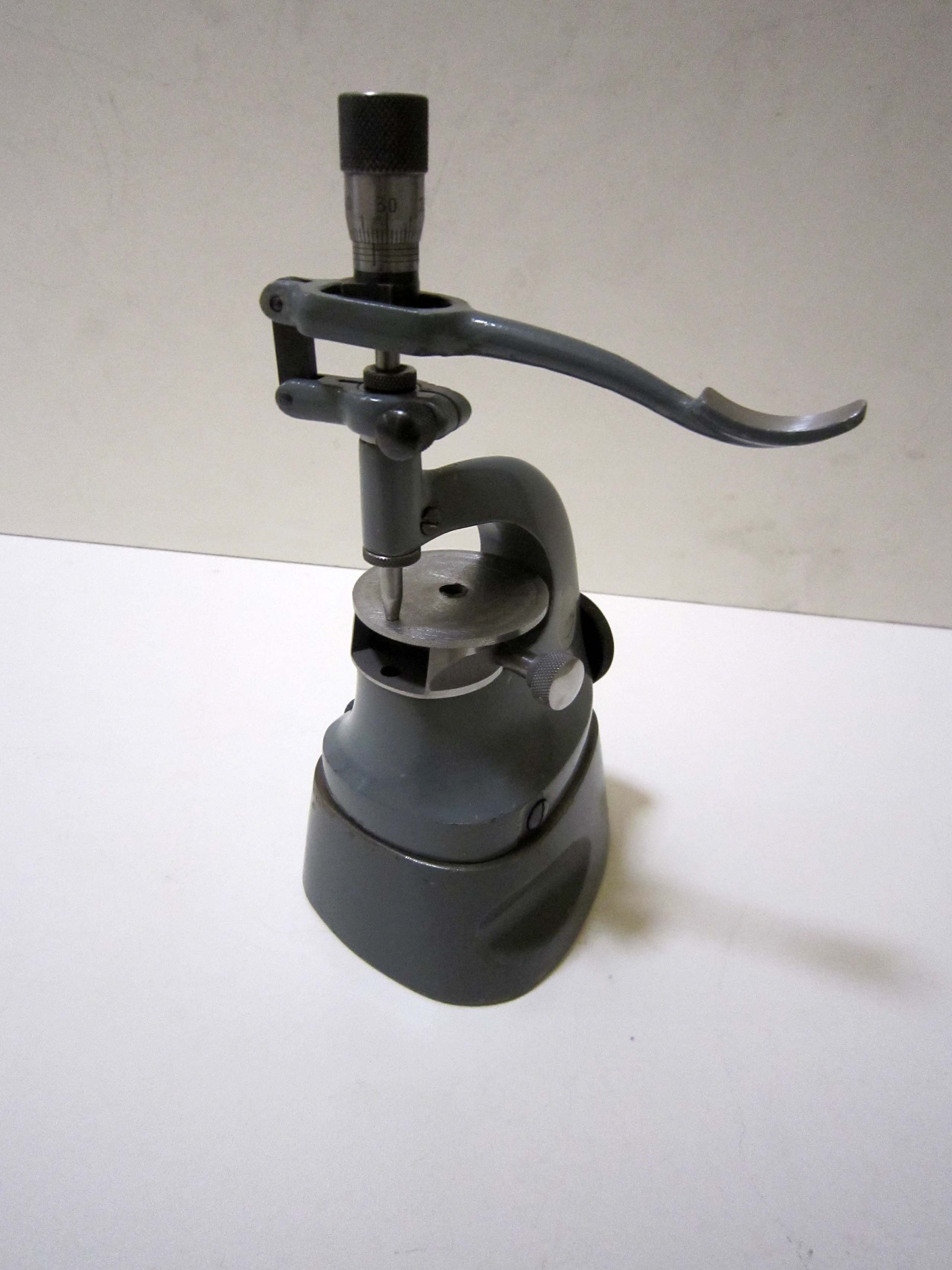 Er besteht aus einem Tisch mit vertikalem Halter, an dem sich eine Pressvorrichtung mit Mikrometerschraube befindet.