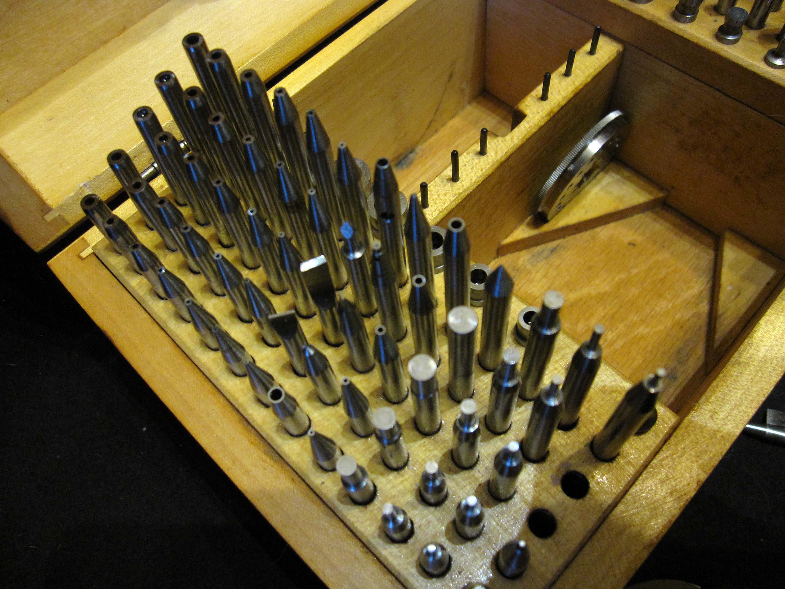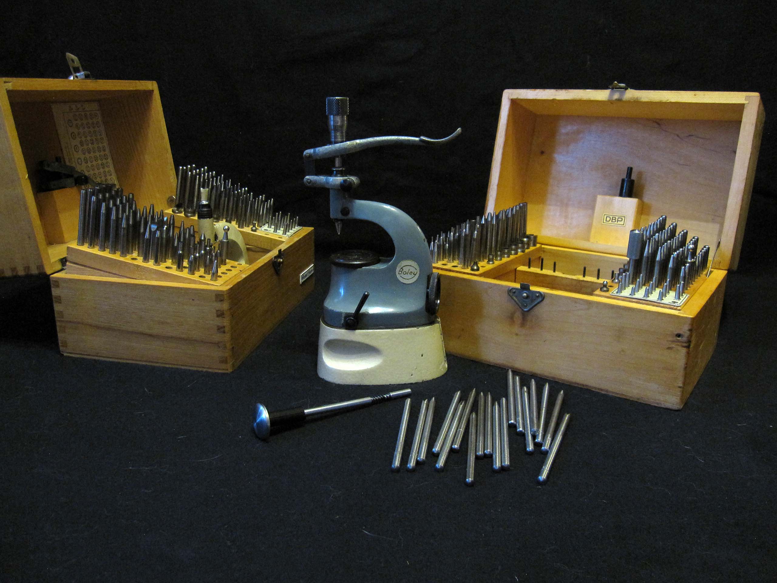 In der Uhrmacherwerkstatt gibt es verschiedenste Pressvorrichtungen mit unterschiedlichen Funktionen. Ihrem Aufbau liegt jedoch ein ähnliches Funktionsprinzip zugrunde: Unten befindet sich eine Auflage für das Werkstück, oben ein Pressstempel, der für einen bestimmten Arbeitsschritt vorgesehen ist. Form und Größe der Einsätze und Stempel unterscheiden sich kaum, jedoch ist die Befestigungsart der Stempel bei jeder Presse leider unterschiedlich. Bei Steinpressen haben die Aufnahmen in der Regel einen Durchmesser von 4 mm, während bei einer Triebnietmaschine die Punzen einen Durchmesser von 4,7 mm haben. Daher benötigt jede Presse einen passenden Satz an Stempeln. Den umfangreichsten und vielseitigsten Satz an Punzen bietet die Boley-Potance.