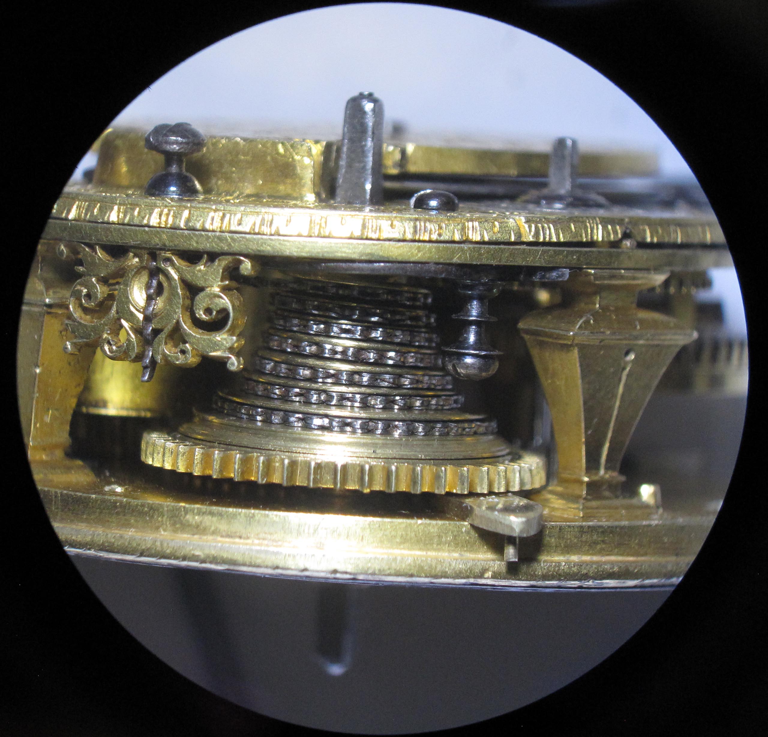Repair and restoration of a table clock with a verge escapement, driven by a fusee (cone) and chain.