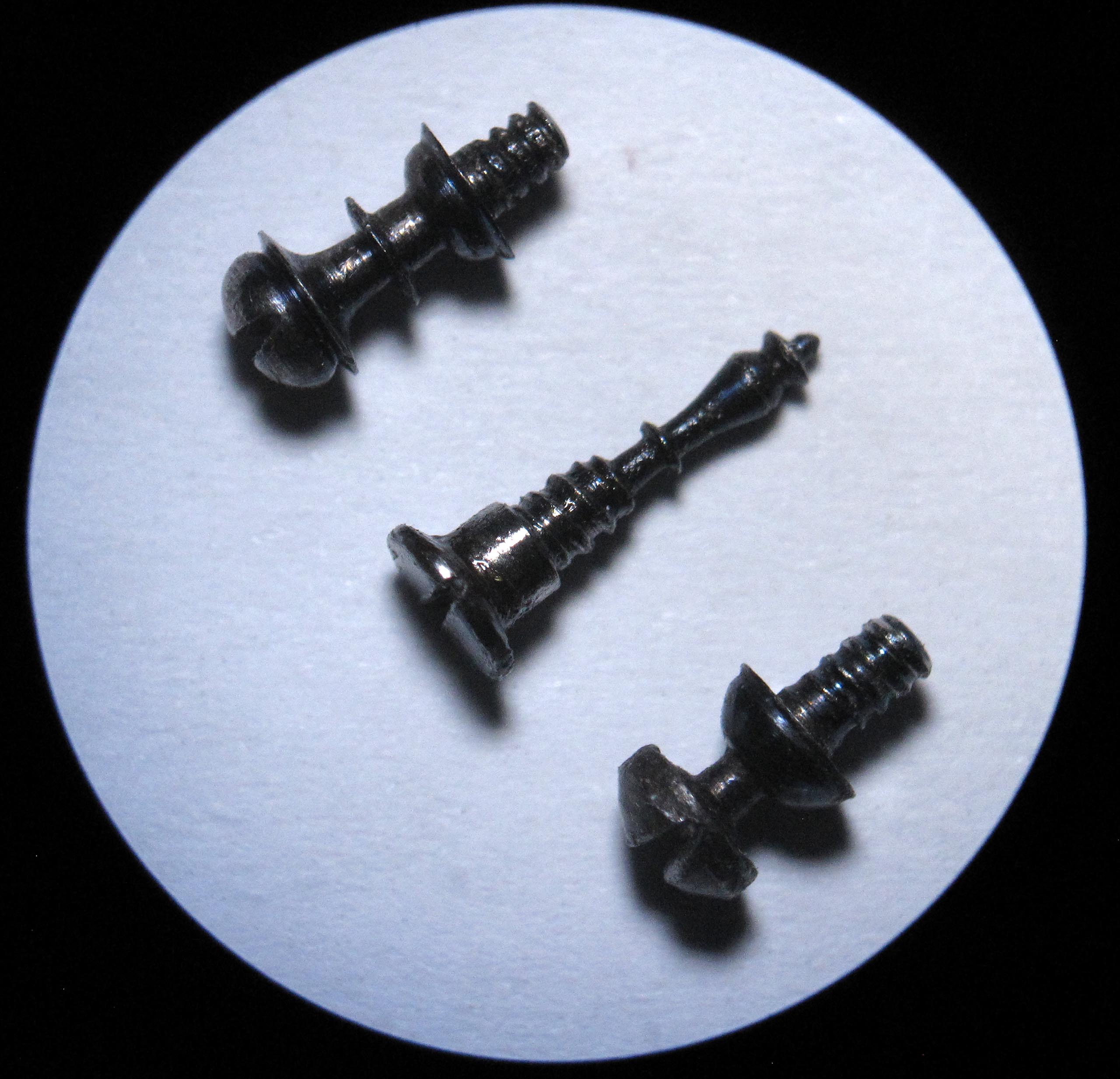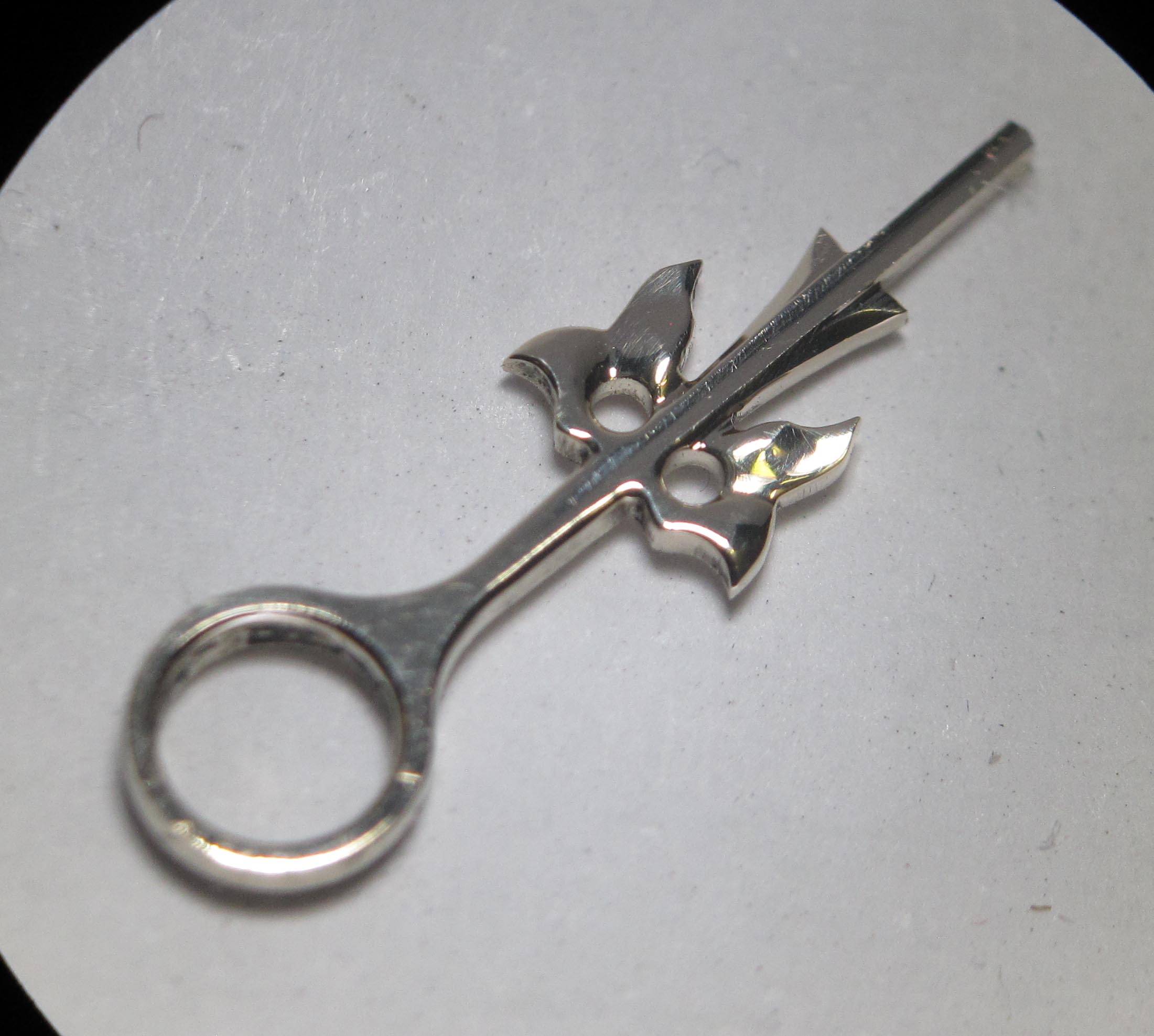 One of the hooks on the fusee chain was broken off. I manufactured a new one from steel. I also made a small rivet (Ø 0.32 mm × 0.6 mm) to fasten the hook.