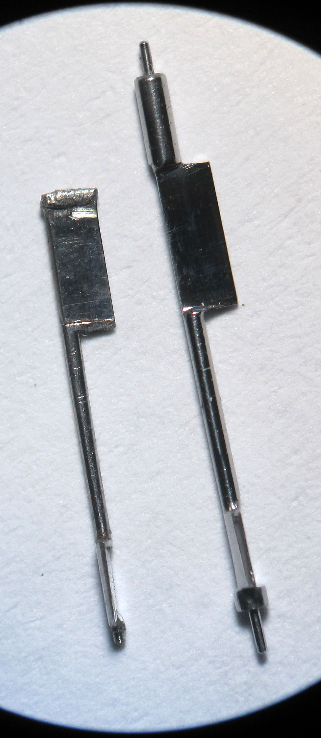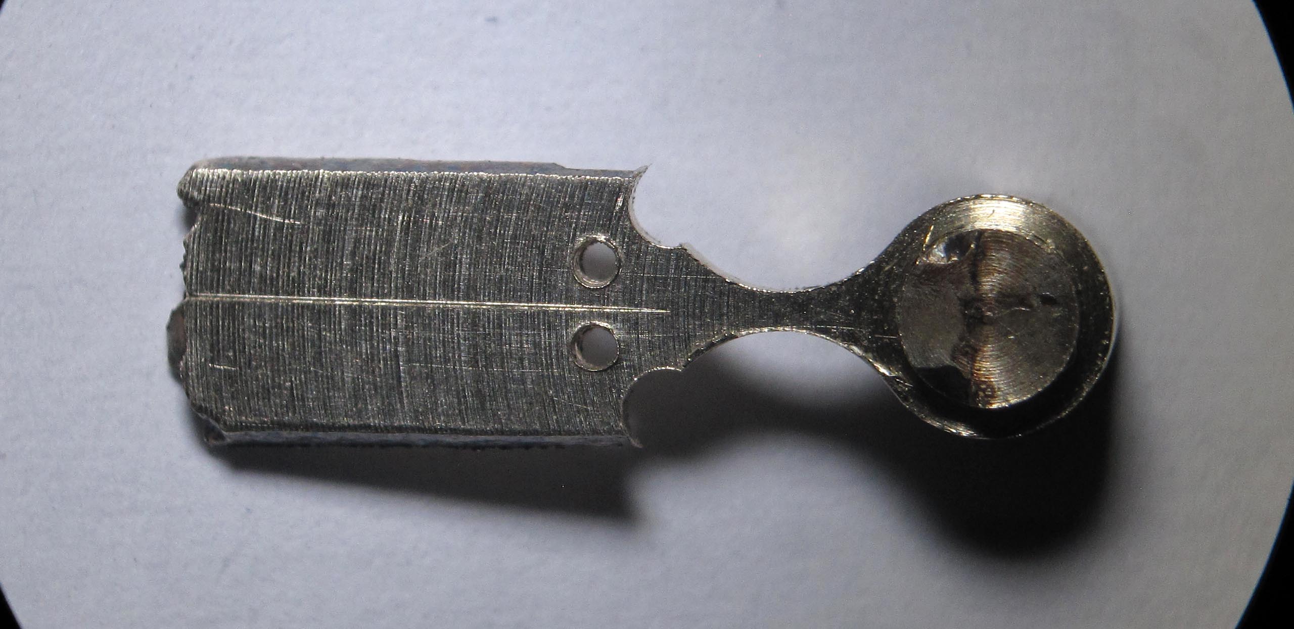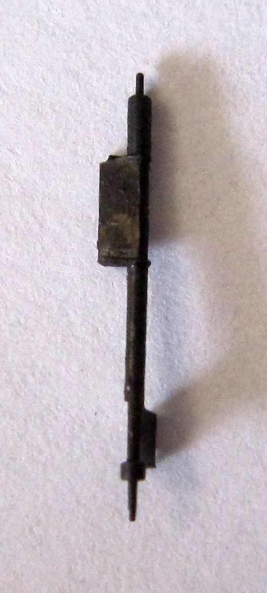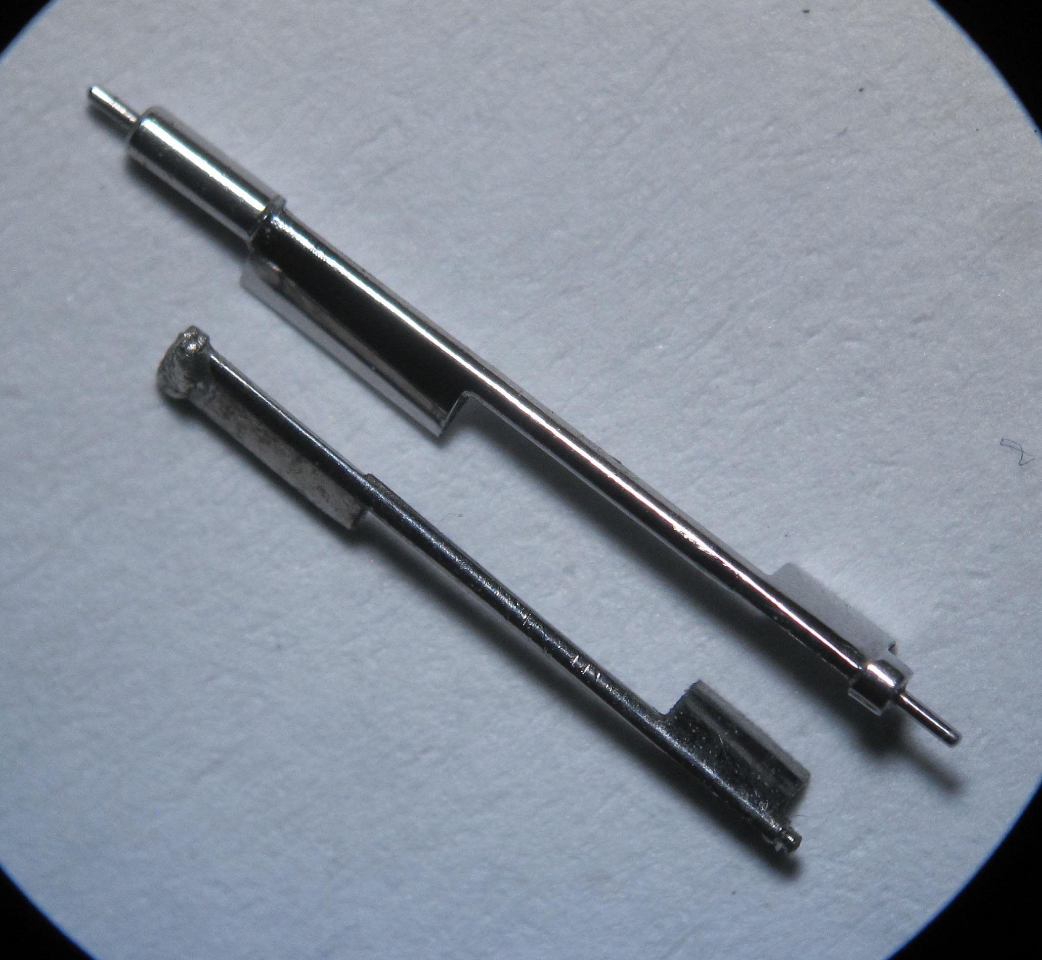 The click appeared to be heavily worn, so I made a new one. In the photograph, the wear is visible, as well as the broken pin with a diameter of approximately 0.55 mm and a length of about 0.85 mm.