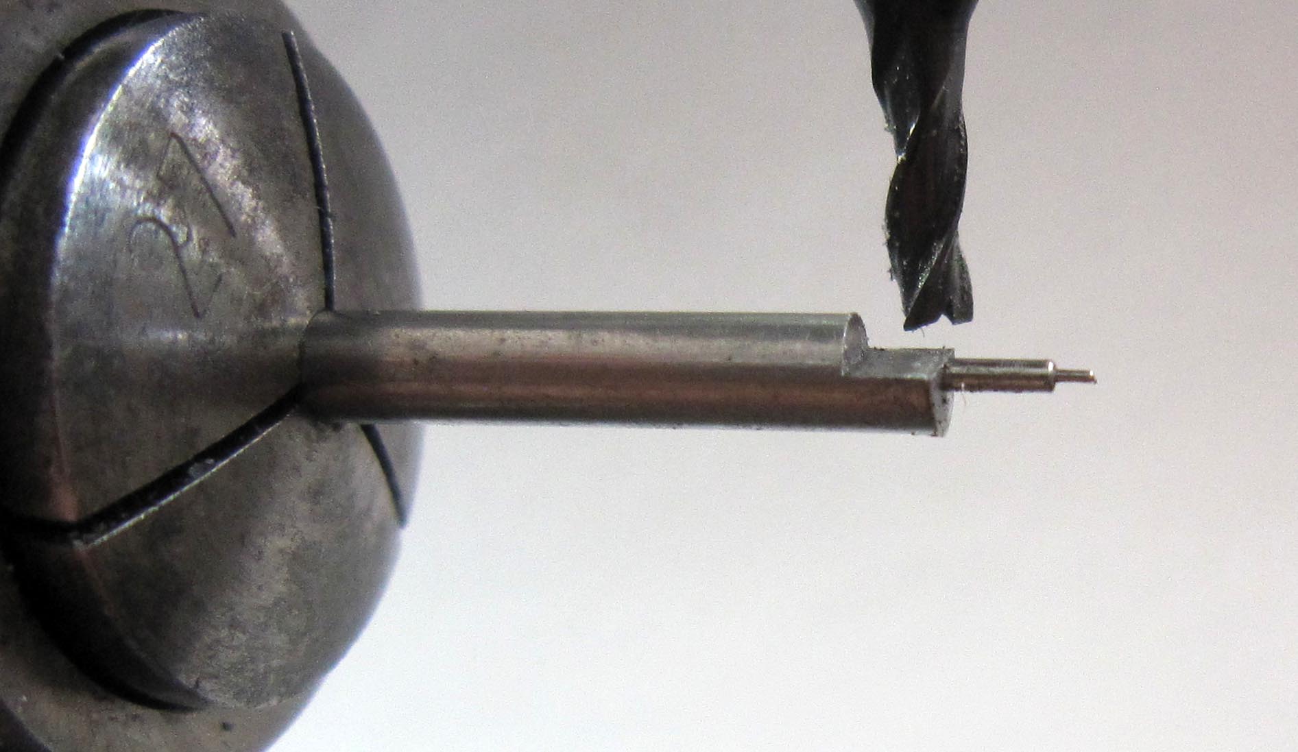 I mounted the hand on shellac, machined a flat surface on the back side, and drilled a hole Ø 1.5 mm in the spherical part.