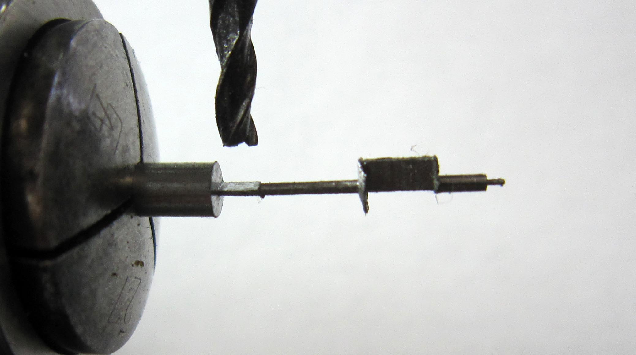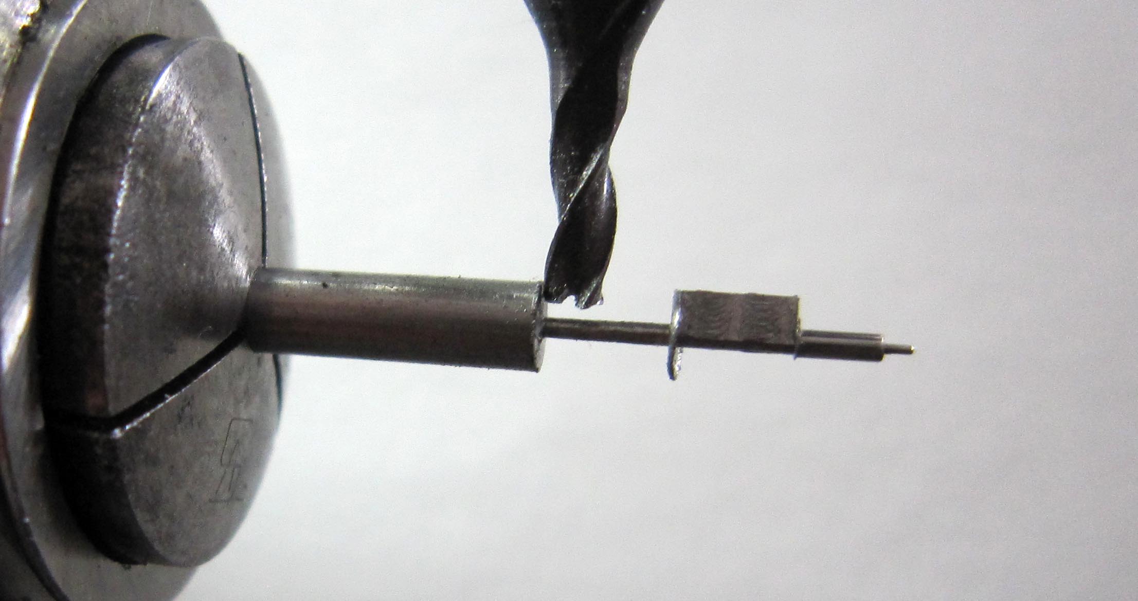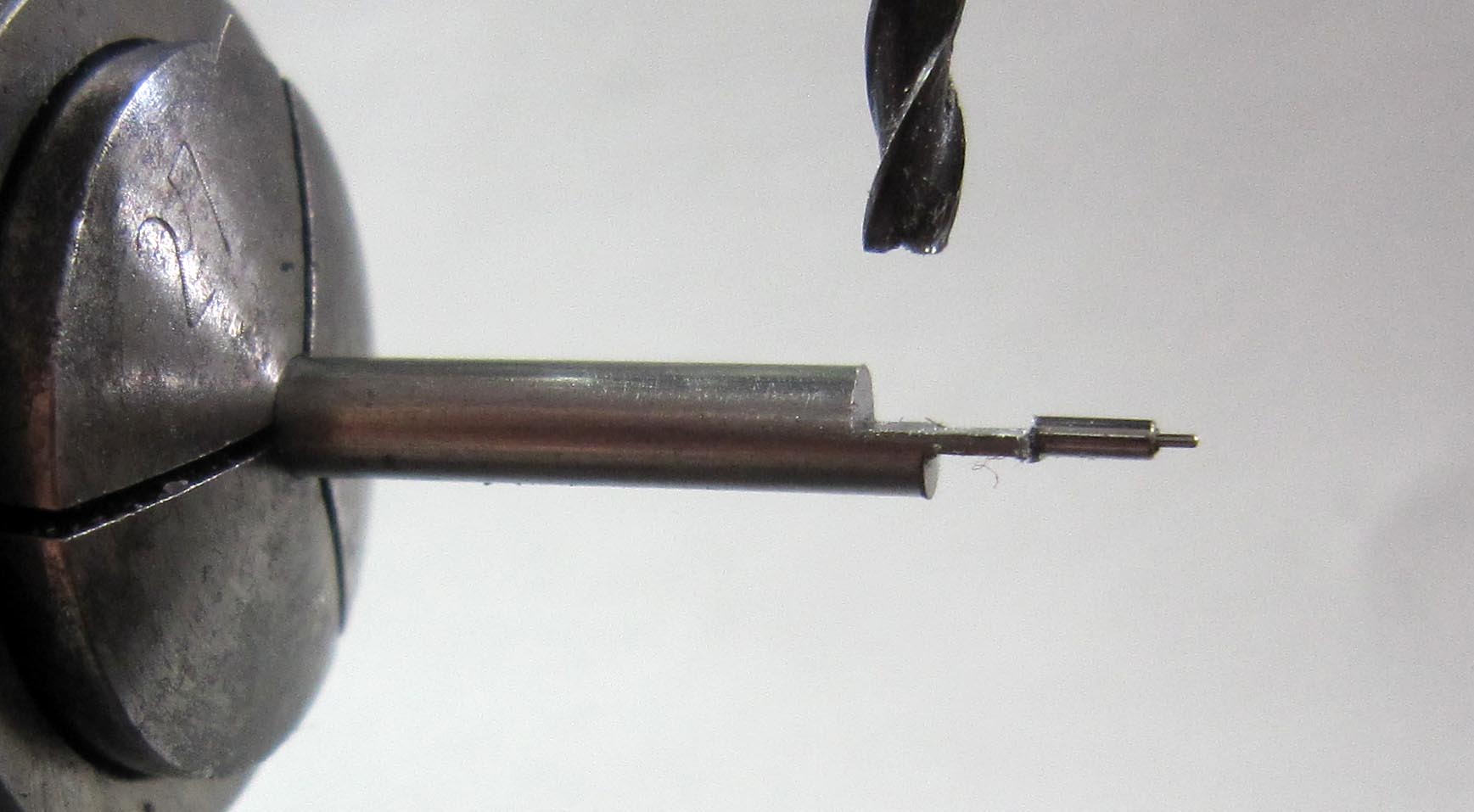 In the movement, the pivot of one of the pinions was broken off. A new pinion had to be made. The diameter of the pinion is Ø 2.7 mm, the pivot diameter Ø 0.29 mm. The pinion has 6 leaves. I milled the leaves using a 19th-century tool.