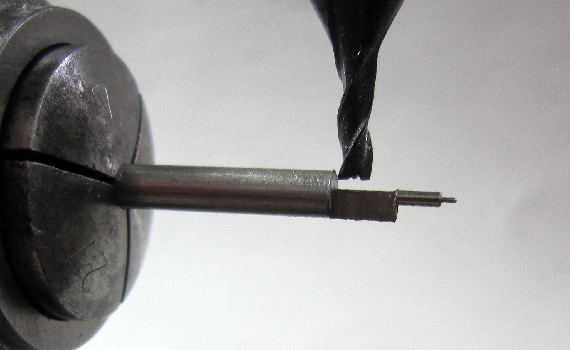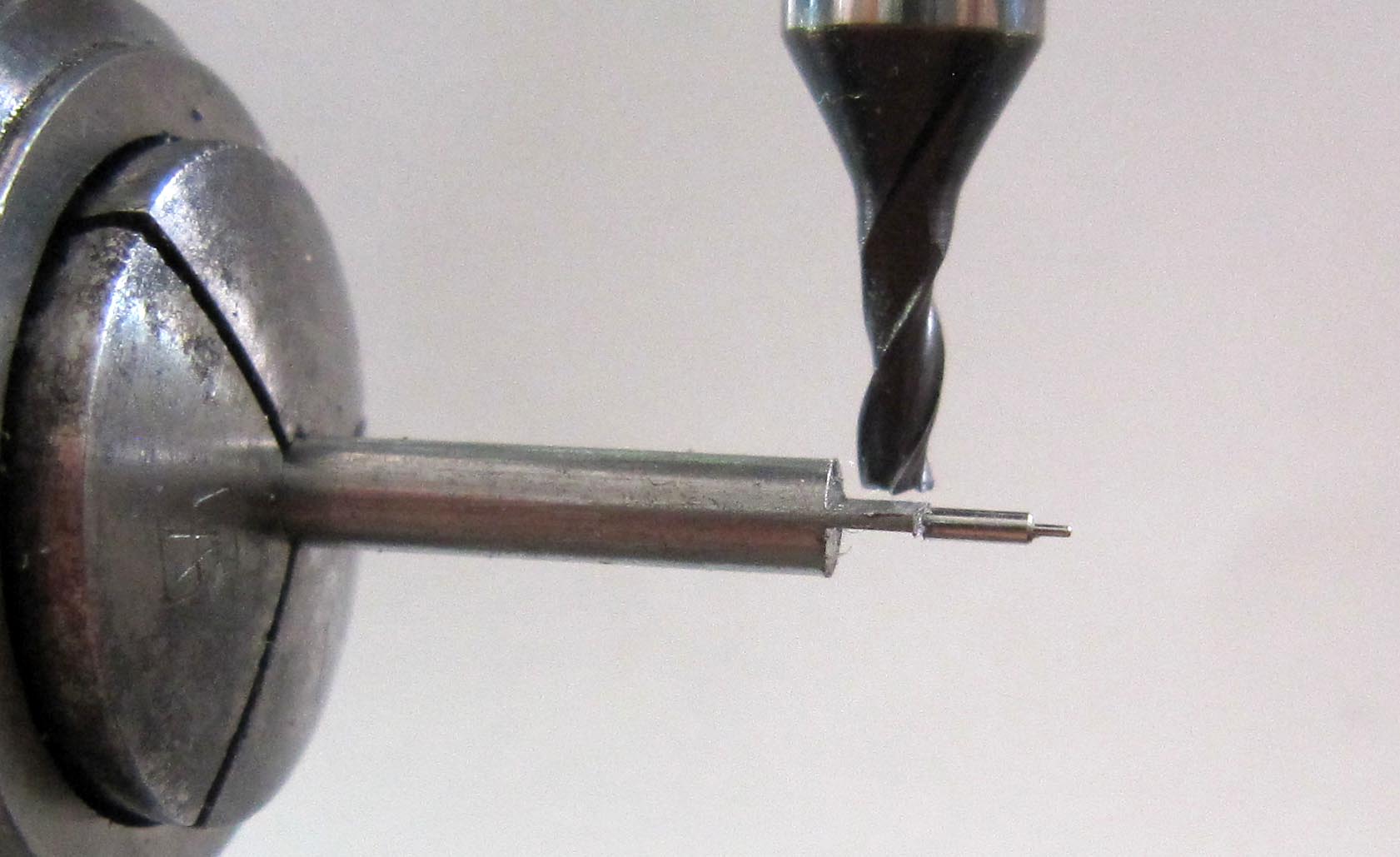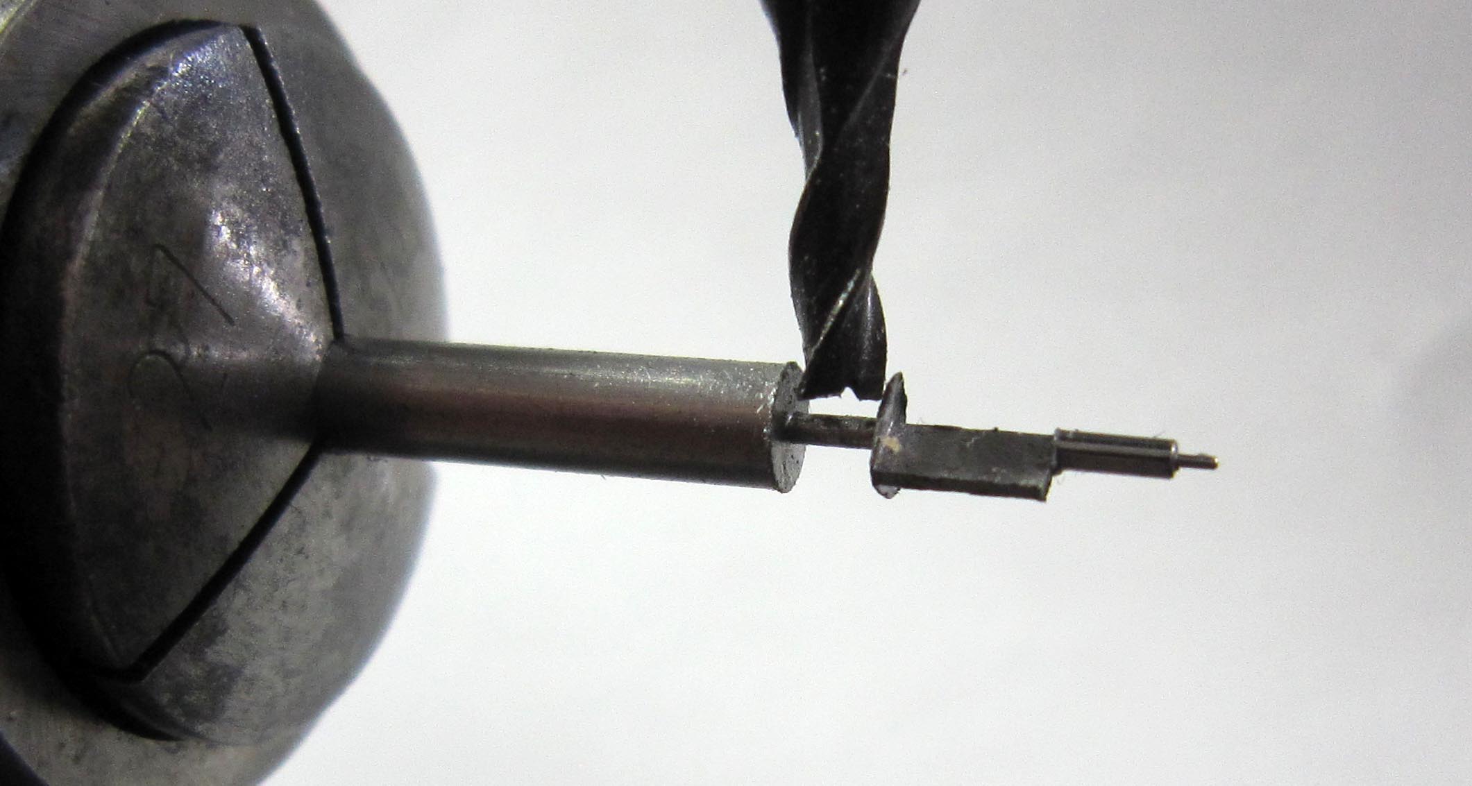 In the movement, the pivot of one of the pinions was broken off. A new pinion had to be made. The diameter of the pinion is Ø 2.7 mm, the pivot diameter Ø 0.29 mm. The pinion has 6 leaves. I milled the leaves using a 19th-century tool.