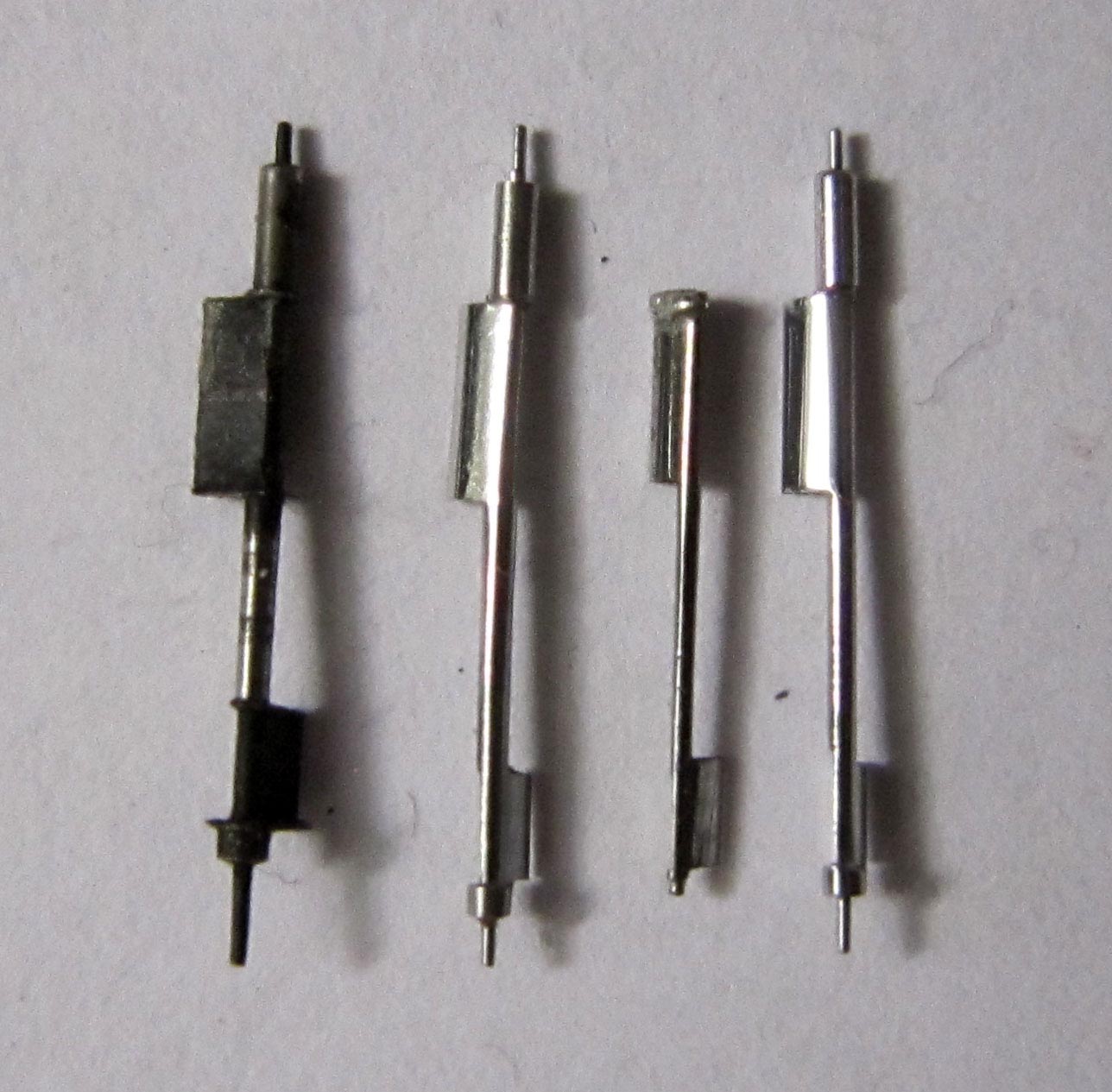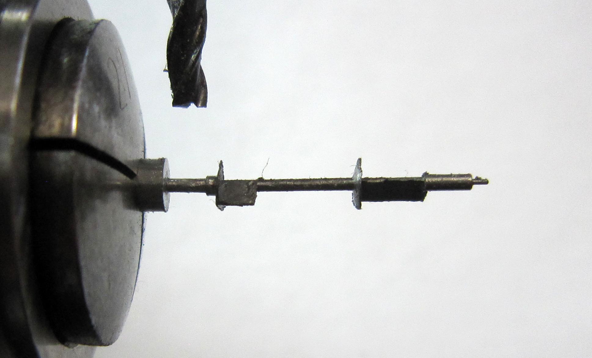 To gain experience, I first produced a trial staff and at the same time set up the milling machine. This took about 10 hours of intensive work. After slightly straightening the balance bridge, I determined that the staff was approximately 0.25 mm too long. Shortening the arbor on such a staff is almost impossible, as it is difficult to clamp without causing damage. I adjusted the dimensions in the drawing. The original thickness cannot be measured exactly; visually it appears to be about 0.5 mm. I made the balance side slightly thicker at 0.8 mm — excess material can always be removed later. I also made the lower section Ø 0.8 mm and increased the height of the lower pivot to 0.9 mm.