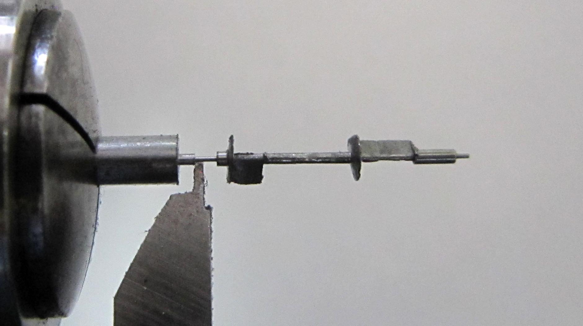 The next 10 hours were spent working on the pallets to give them the correct shape. It is best to grind the pallets while the balance staff is clamped in the lathe. Afterwards, I smoothly polished the pallet surfaces with Degussit. The section between the pallets was slightly turned down again on the lathe. I burnished the pivots and rounded the pivot shoulders.