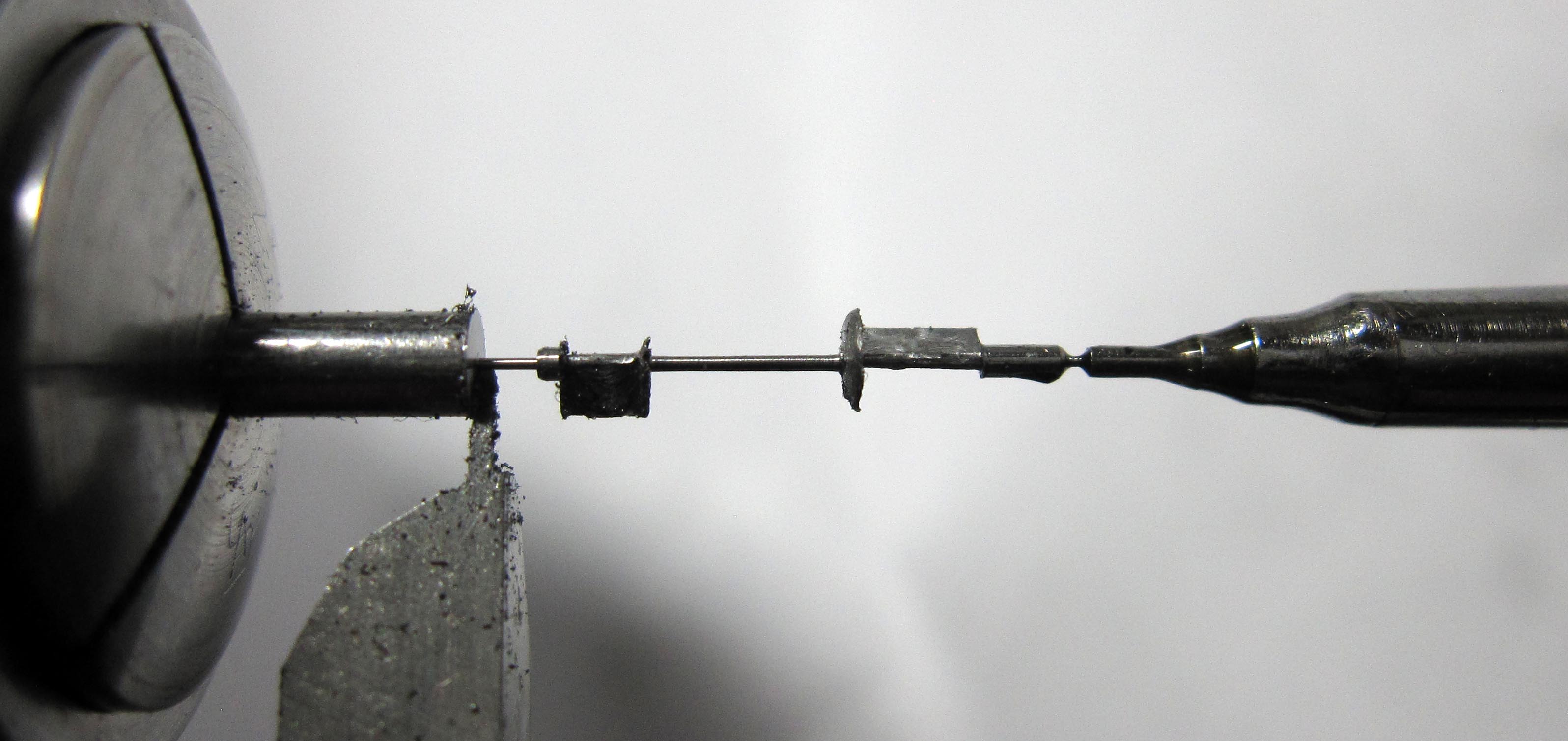 rough-milled the staff to a diameter of 0.6 mm and a length of 6 mm