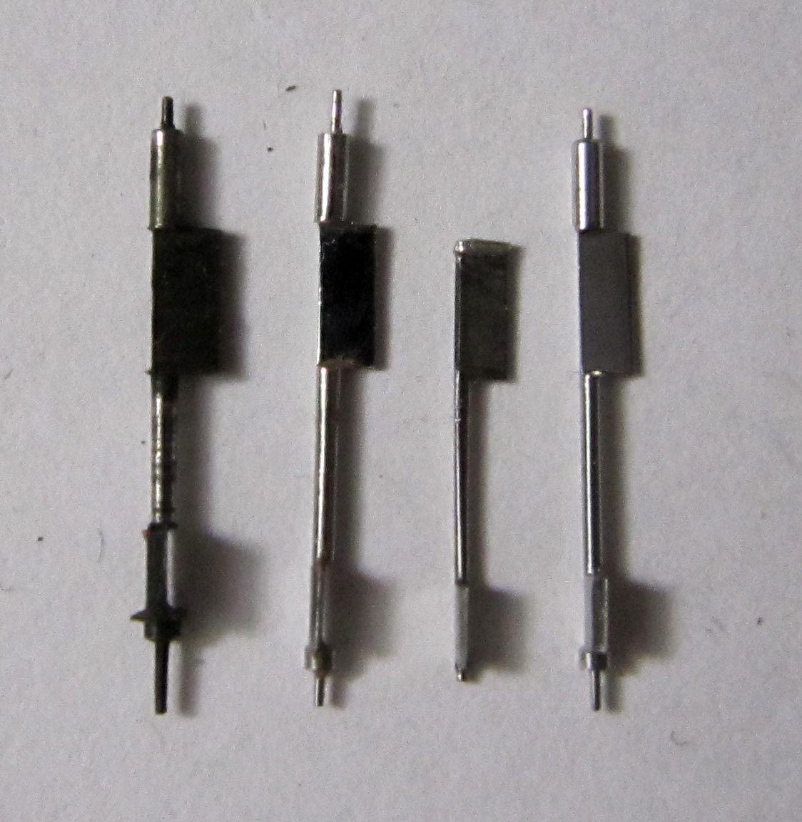Now the balance staff can be installed and the length checked. First, I shortened the pallets slightly. Since the final dimension was unknown, I had to repeatedly remove small amounts of material, install the staff, and test it until the pallet began to slide off the escape wheel without touching the teeth.