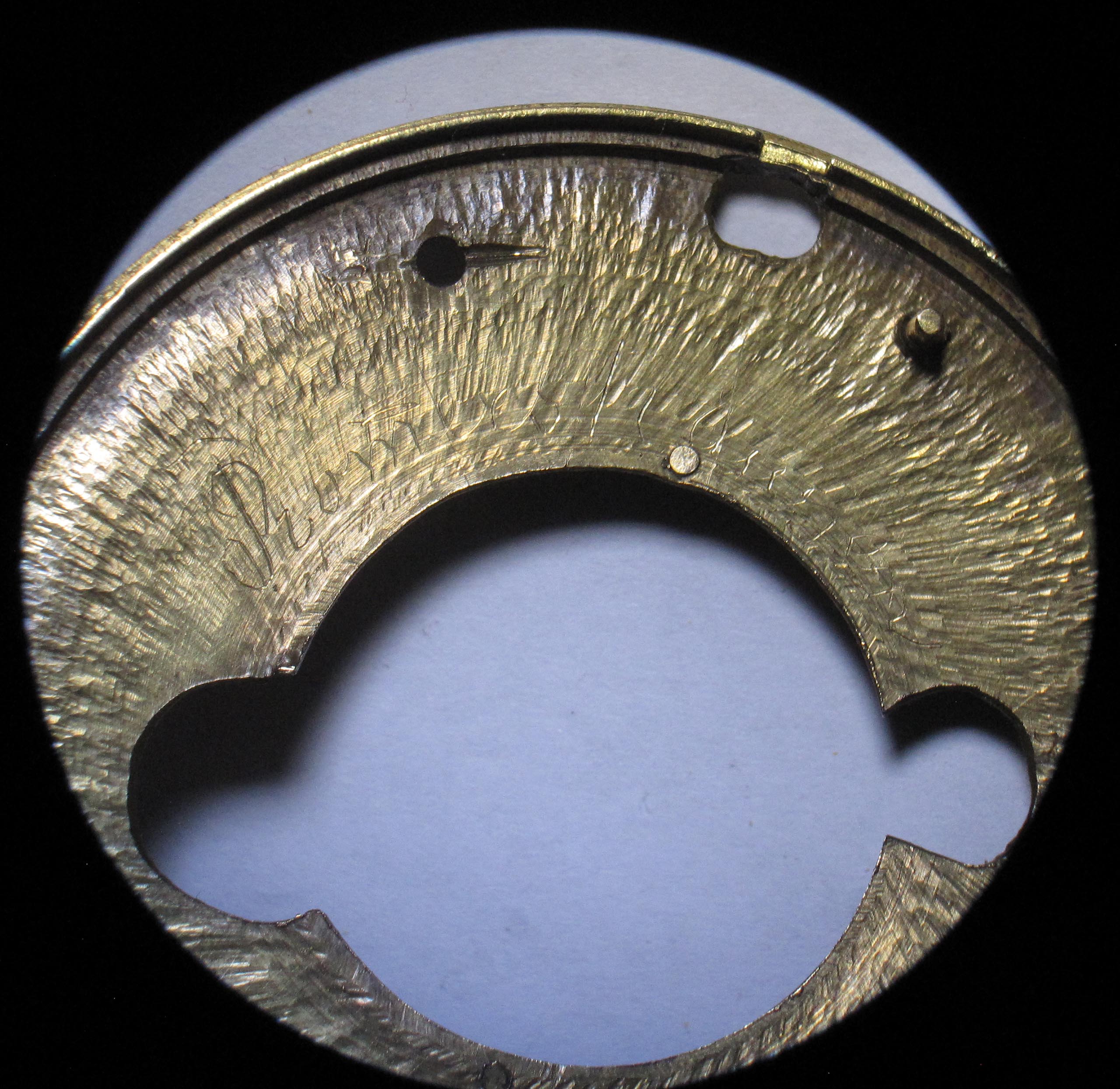 No numbers are engraved on the plates; there is only a stamped “B” and a couple of illegible signatures left by watchmakers. There is also a signature on the reverse side of the dial reading “Romershausen”.
