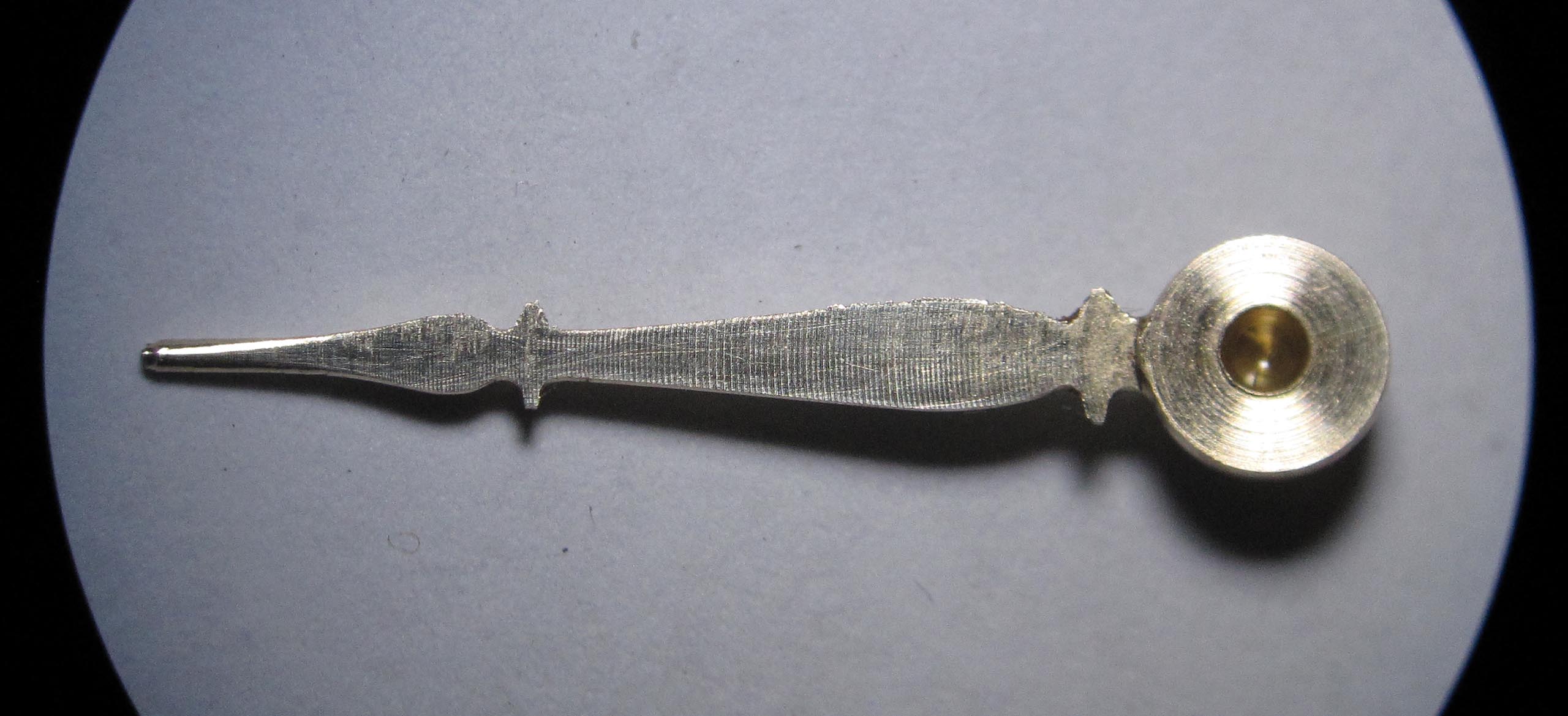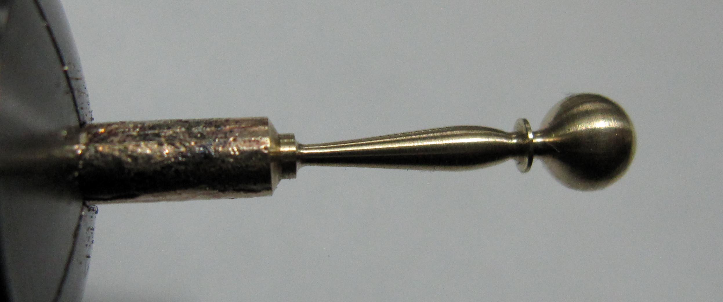 I turned a sphere Ø 4.4 mm on the thicker end using a lathe; this is the part of the hand that fits onto the minute arbor (cannon pinion).