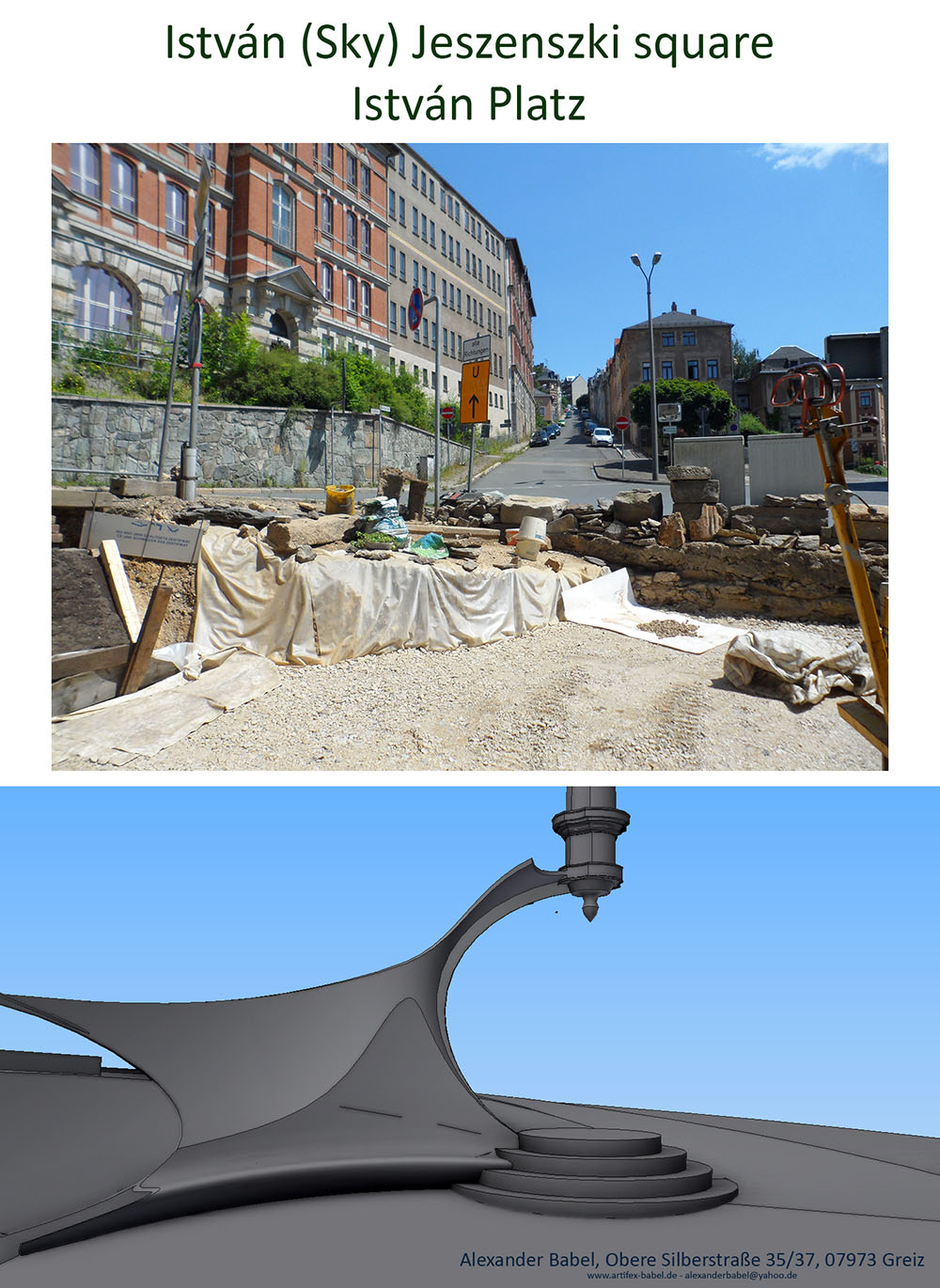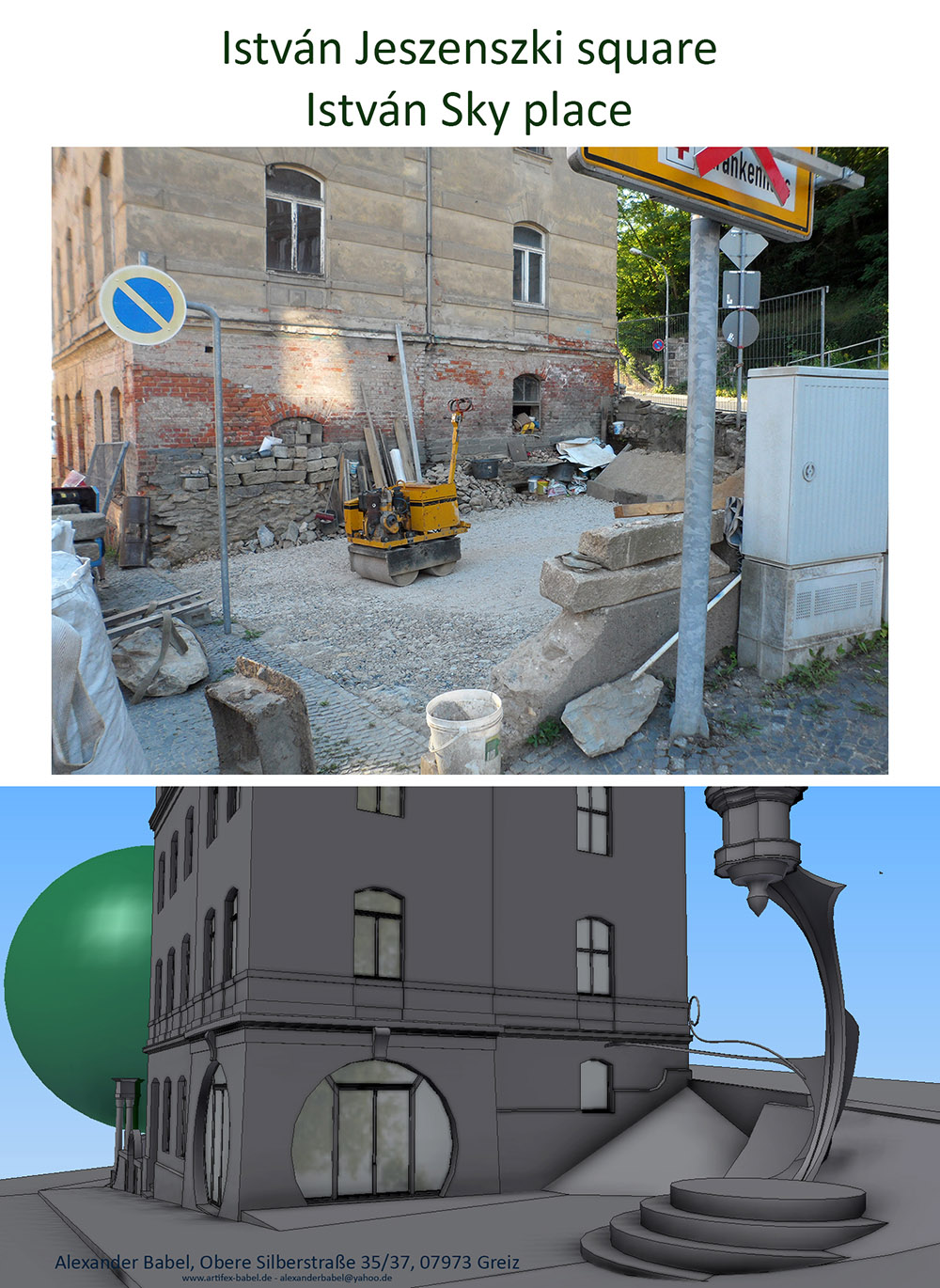 После смерти Иштвана эта небольшая открытая площадка в 75 кв. метров на перекрёстке перед зданием стала носить его имя, а замысел композиции в связи с этим был пересмотрен: к обелиску добавились элементы, символически связанные с образом самого Иштвана.