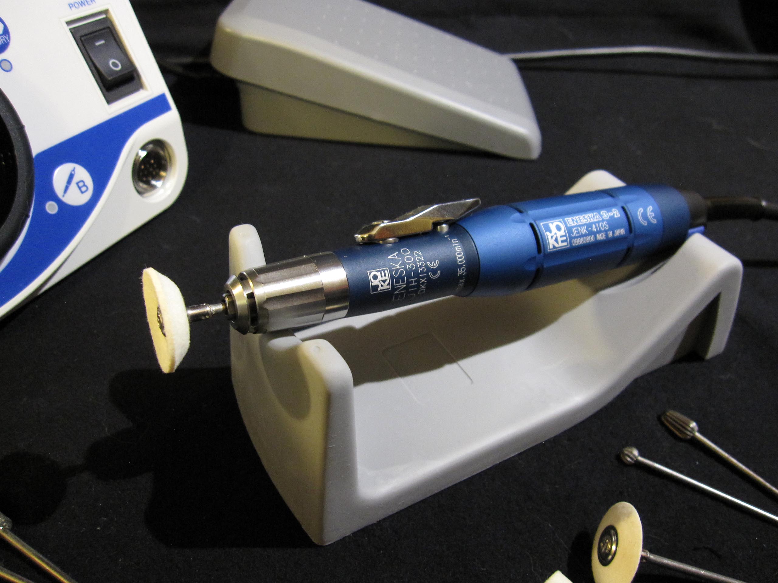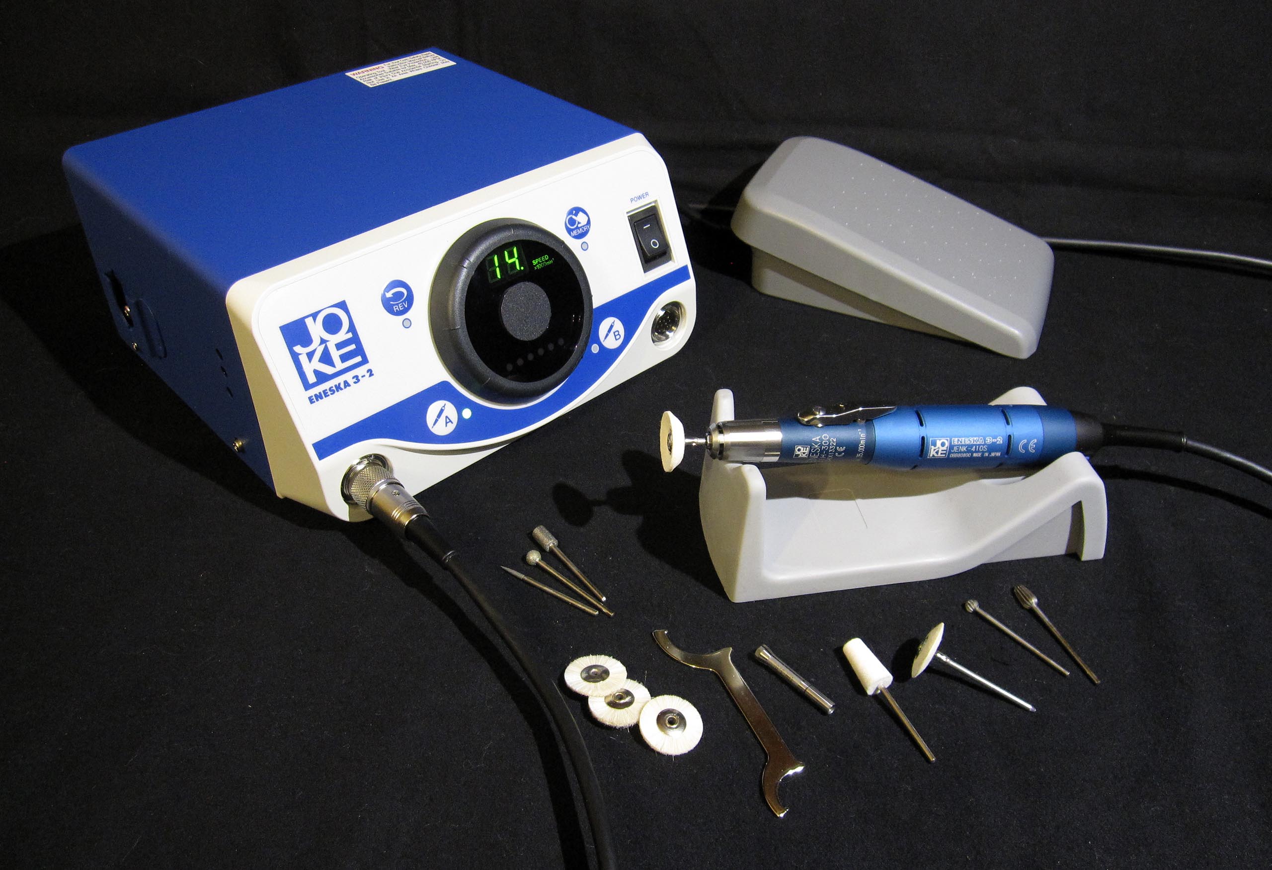 Полировальная система от Joisten и Kettenbaum имеет превосходное качество промышленного уровня. Микромотор очень тихий и не притязательный в техническом обслуживании. Сама ручка и мотор составляют единое целое. Систему можно включать или на самом моторе или на приборе управления. Ко всему прочему можно также ножной или коленной педалью управлять количеством оборотов мотора. У меня шпанцанга 2.35 мм. С помощью удобной системы в ручке можно быcтро менять насадки.