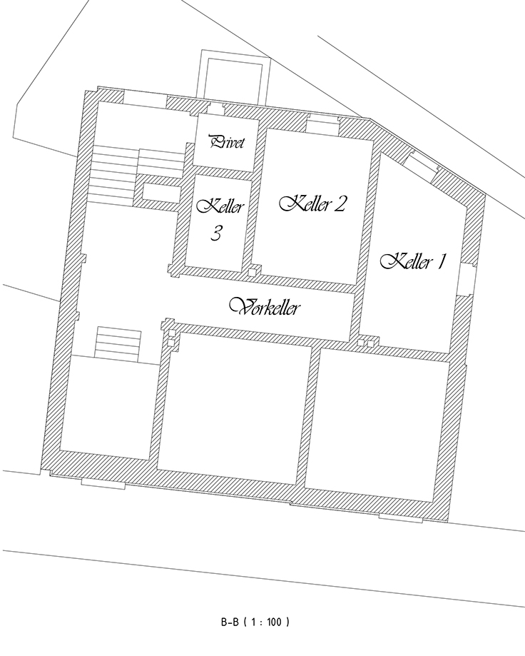 Die Vermessung hat ergeben, dass das Gebäude nicht rechtwinklig ist. Ich habe mehrmals die Messergebnisse überprüft. Da nur das Treppenhaus einen rechtwinkligen Grundriss hat, wurde das Fundament bewusst so angelegt. Die Baumeister haben sehr Präzise gearbeitet. Die Abweichungen betragen manchmal wenige Millimeter.