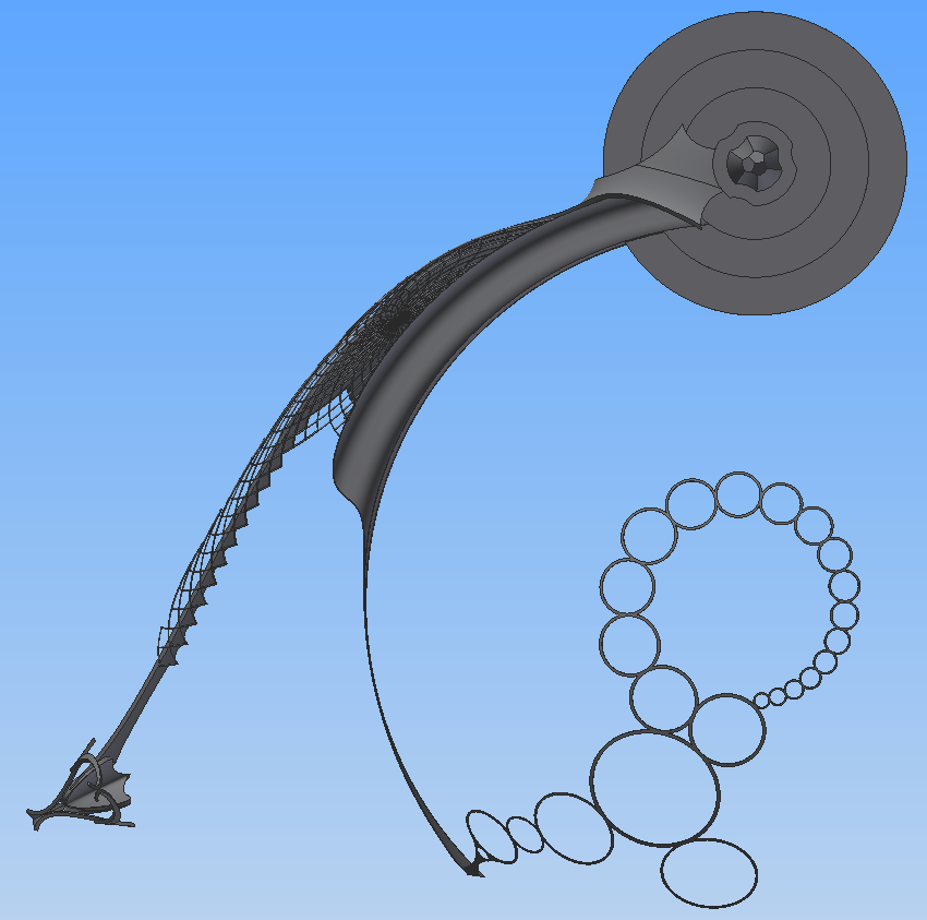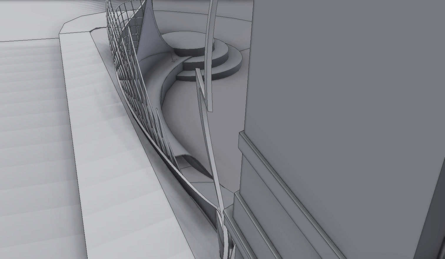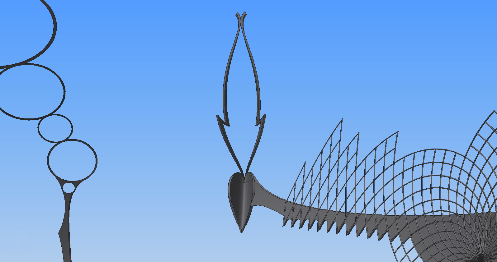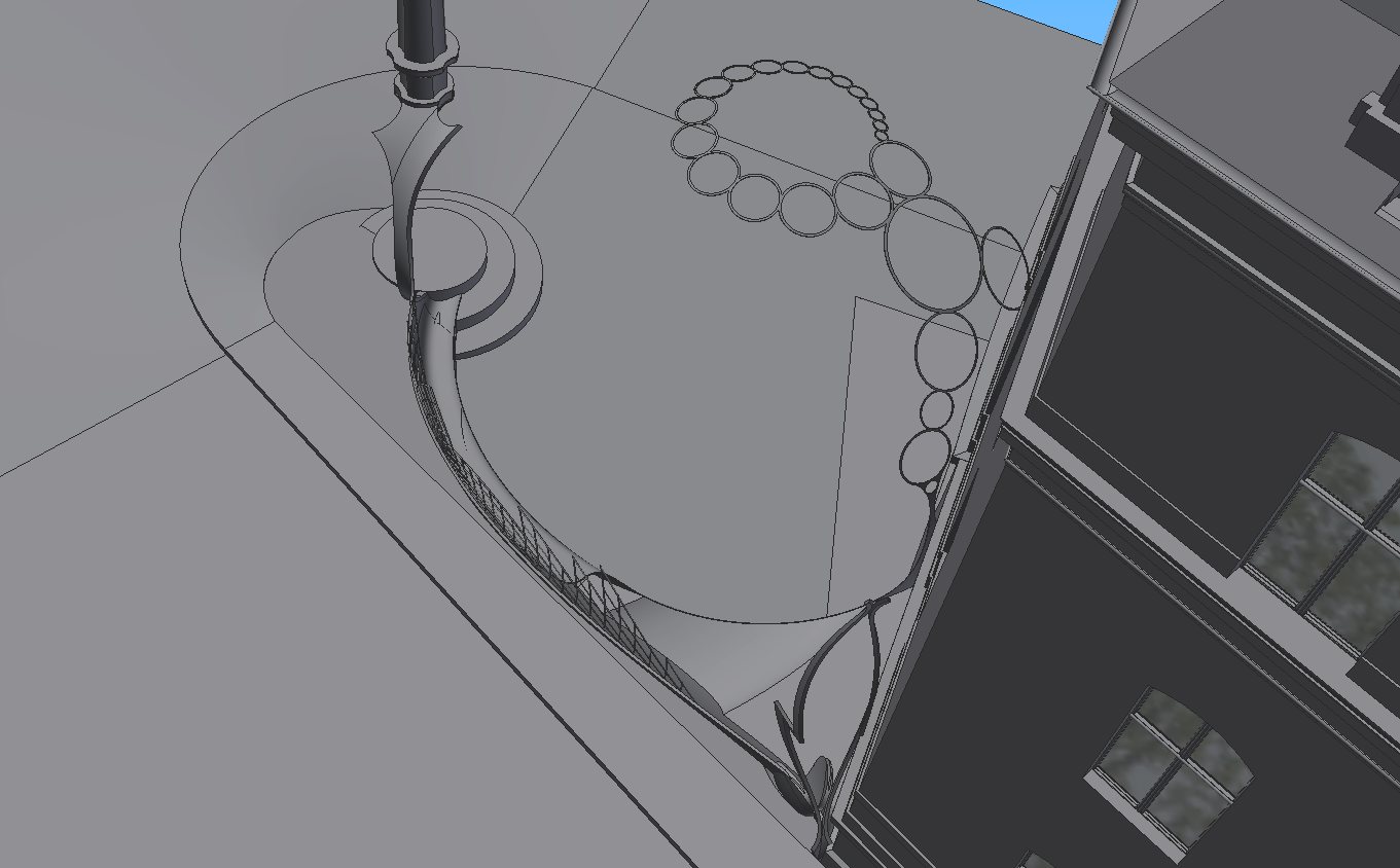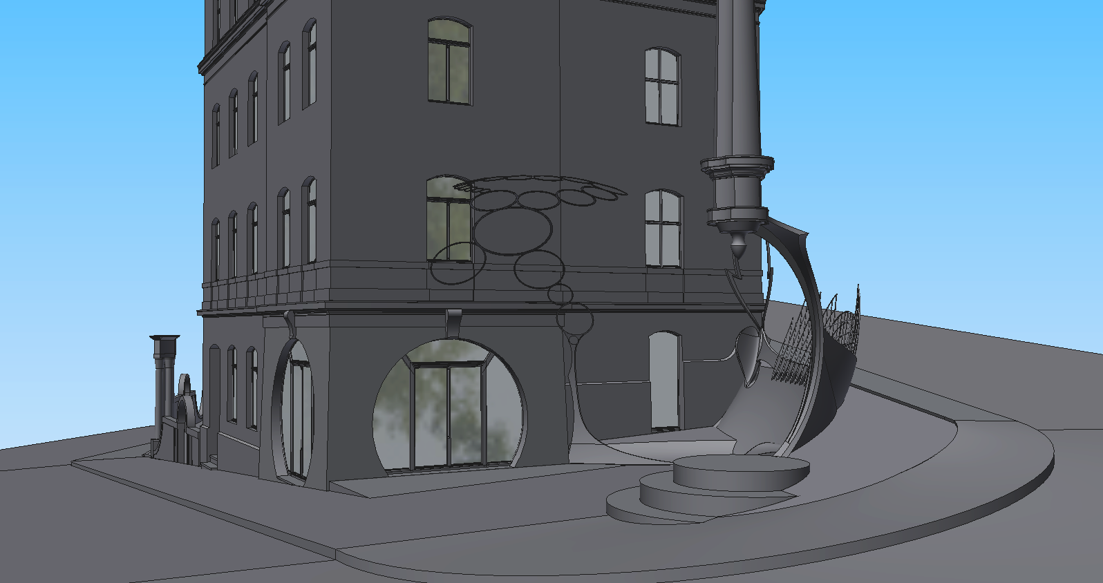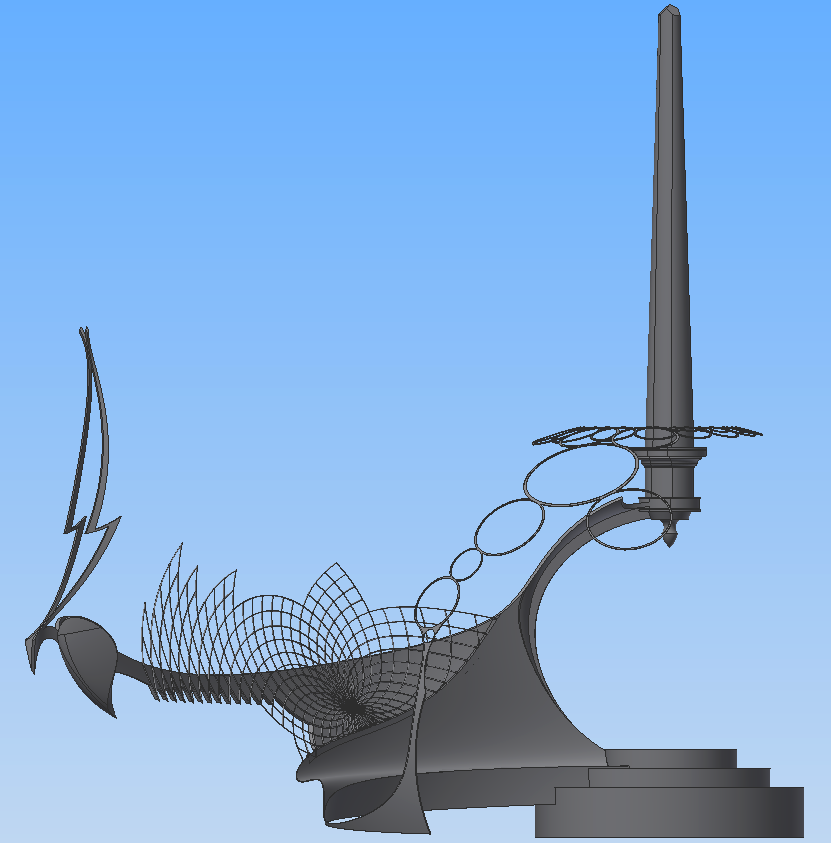 In den ursprünglichen Entwürfen war an dieser Stelle lediglich ein bronzener Obelisk vorgesehen. Um die Konstruktion leichter wirken zu lassen, sollten die Flächen des Obelisken mit leuchtenden Glasflächen versehen werden. Istvan kannte diesen Entwurf. Bei unserem letzten Treffen betrachteten wir gemeinsam die Animation dieser Komposition.