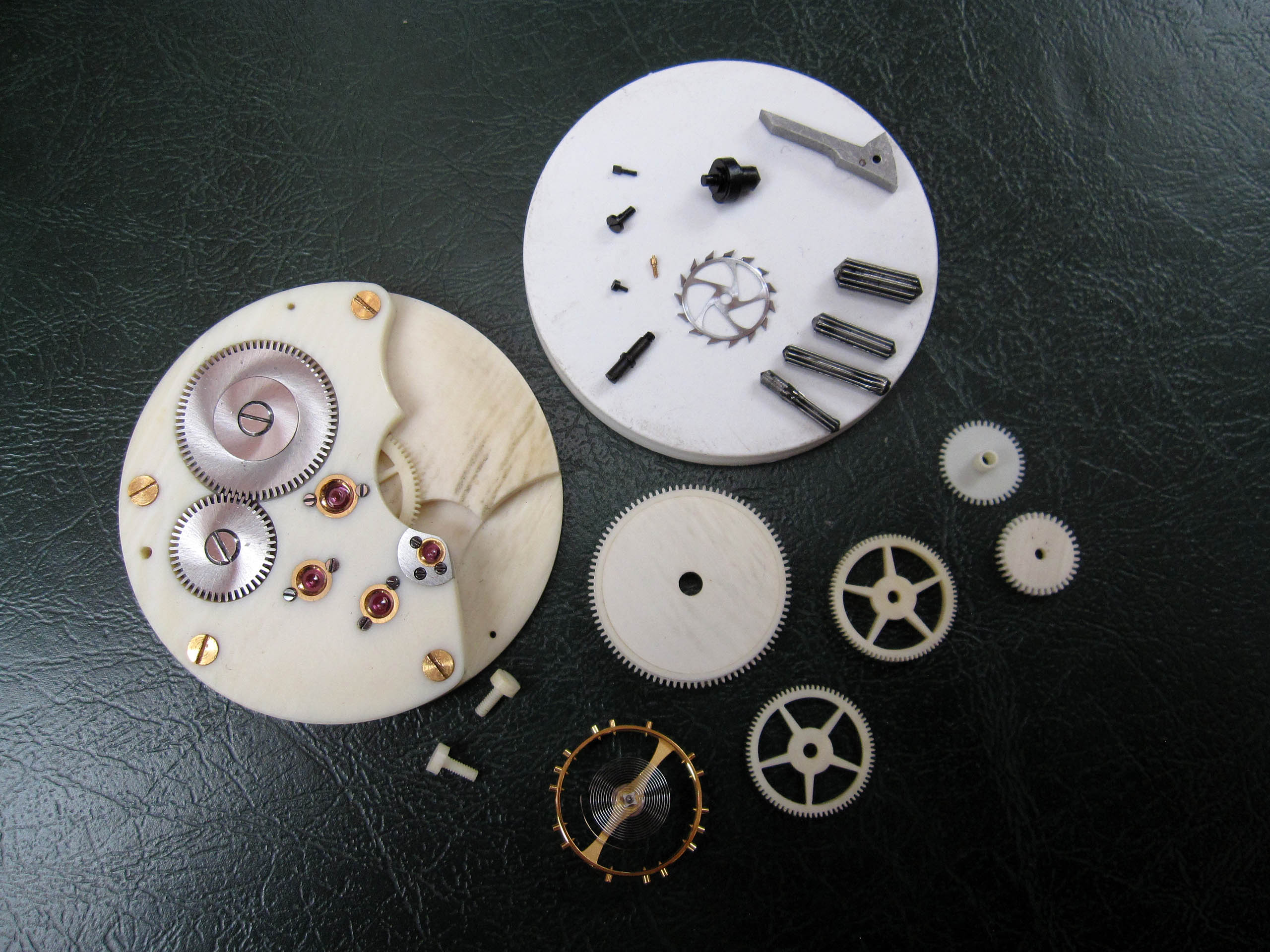 Fein gearbeitete Uhrenteile, Brücken aus Elfenbein, Zahnräder, goldene Schrauben, Unruh.