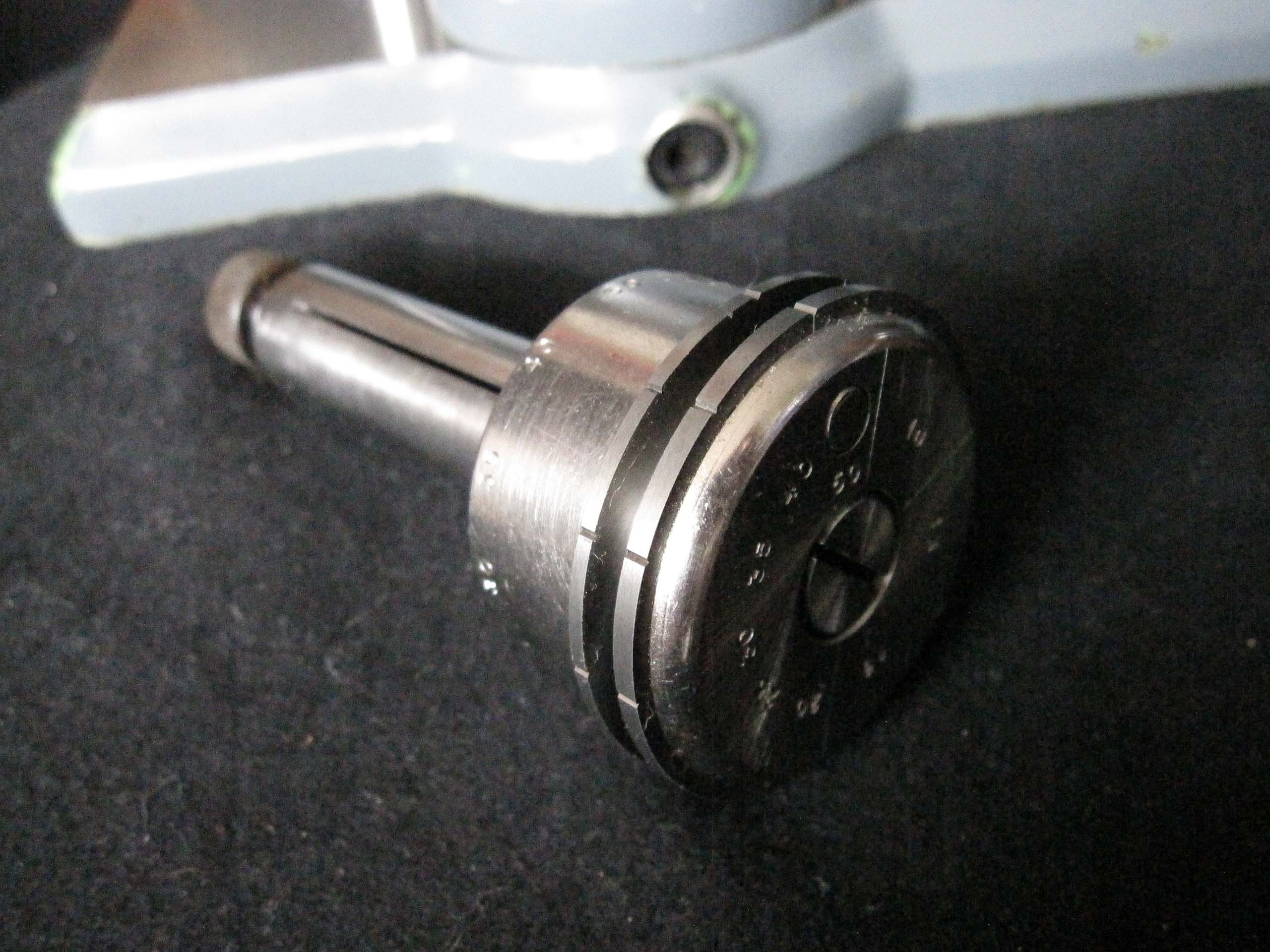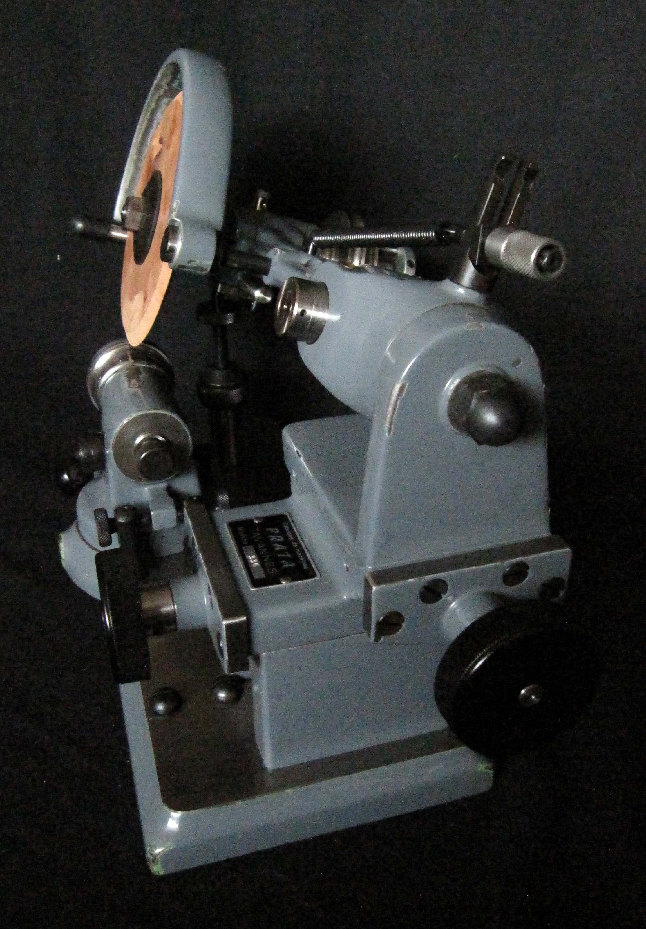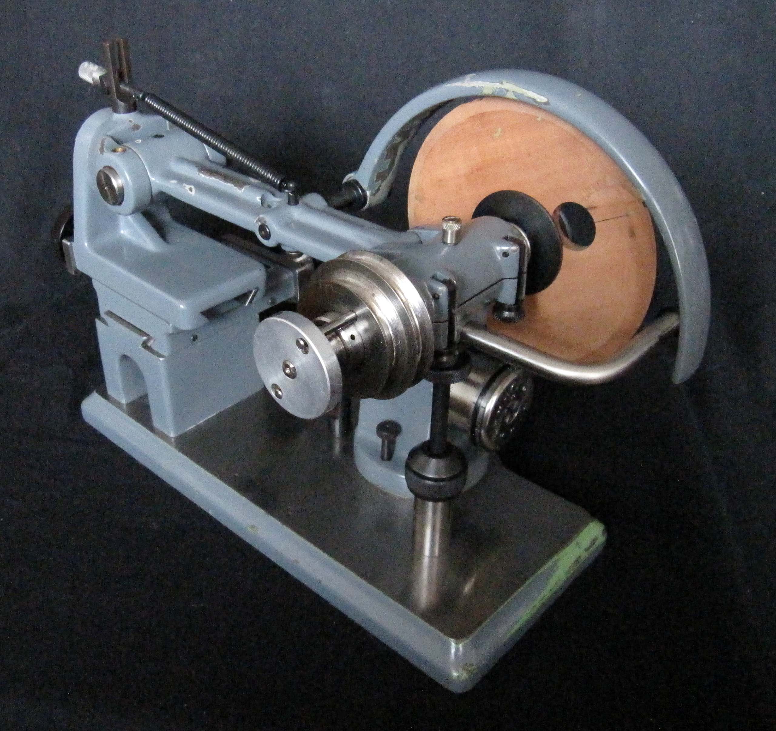 The polishing spindle is made of hardened and ground steel. To balance the weight of the polishing arm, the spring tension is adjusted by moving the hook on the locking mechanism. The cross slides with polishing arm are moved using two knurled-head screws, which facilitates positioning the polishing disc relative to the tooth recesses.