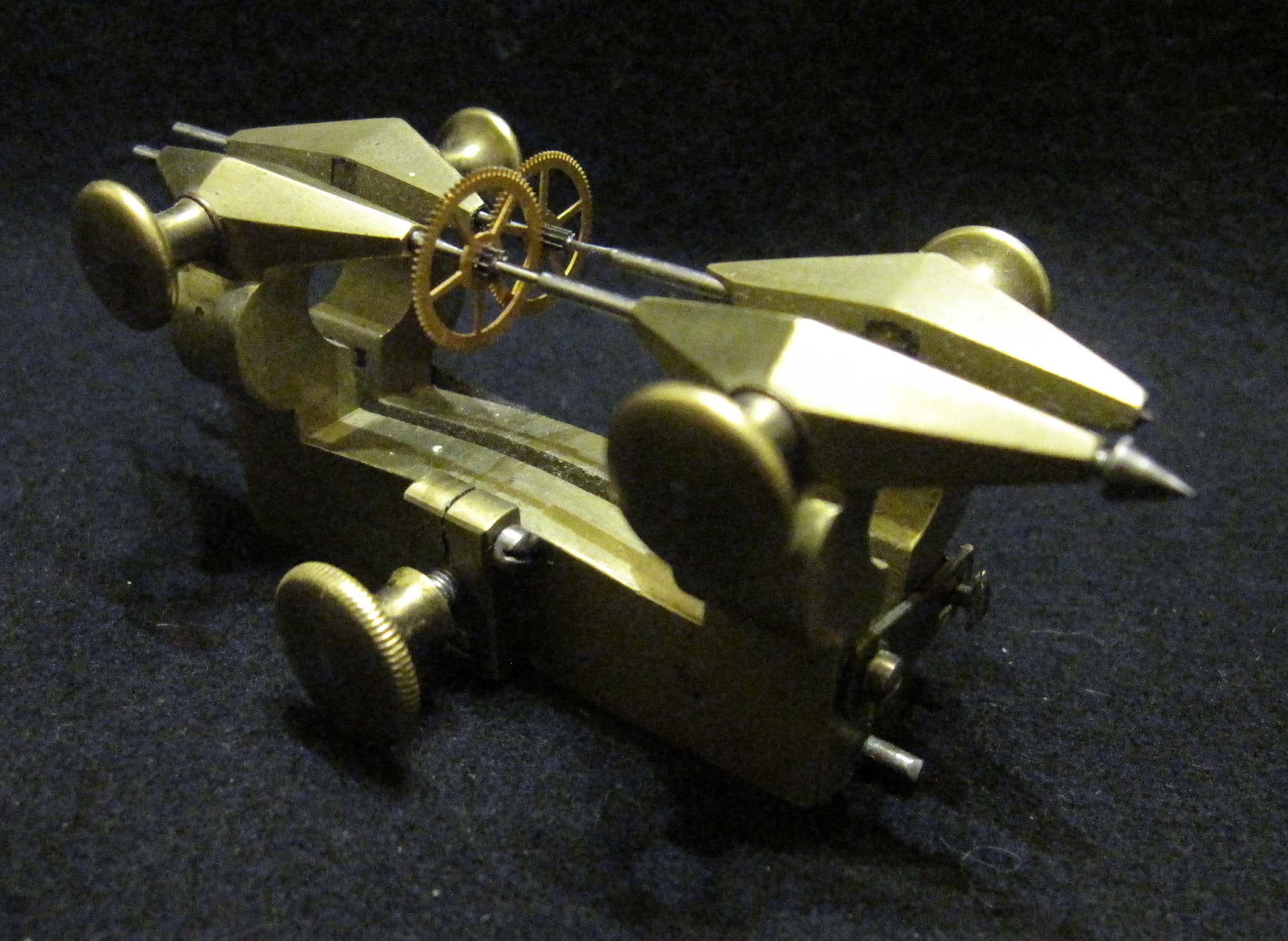 The Luthy-Hirt device is used to determine the length of a balance spring. It essentially consists of two parts: a reference balance at the bottom and a clamping collet at the top. The oscillation frequency of the balance can be adjusted from 10,000 to 22,000 semi-oscillations per hour. The position of the clamp can be adjusted in various directions: vertically, circularly left and right, forward and backward, as well as by rotating it around its own axis.