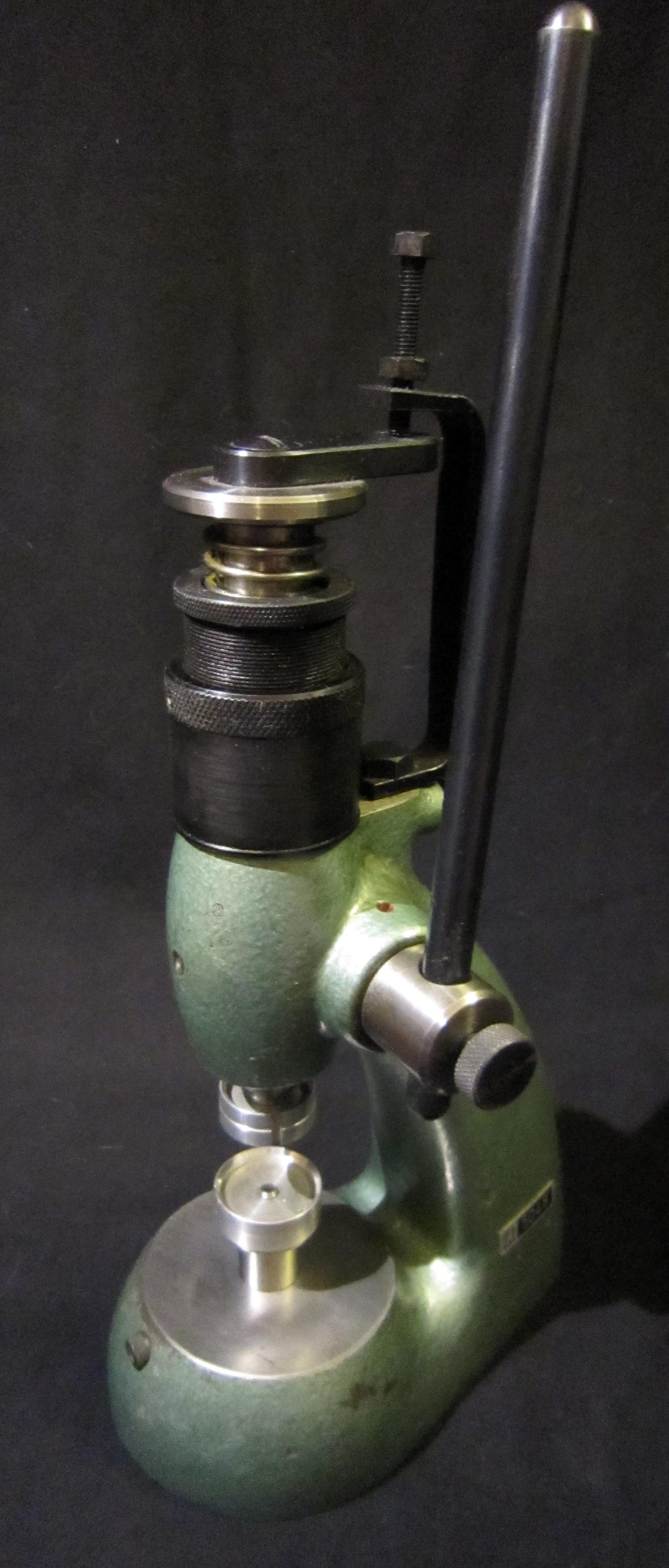 Потанс с приспособлением для прессования камней состоит из нижней подставки и верхней части, представляющей собой столик с загибающимся над ним держателем, в котором есть отверстие,куда вставляется микрометрический болт и пуансоны. На столике имеется перфорированная стальная шайба. Есть также рычаг-ручка для прессования.