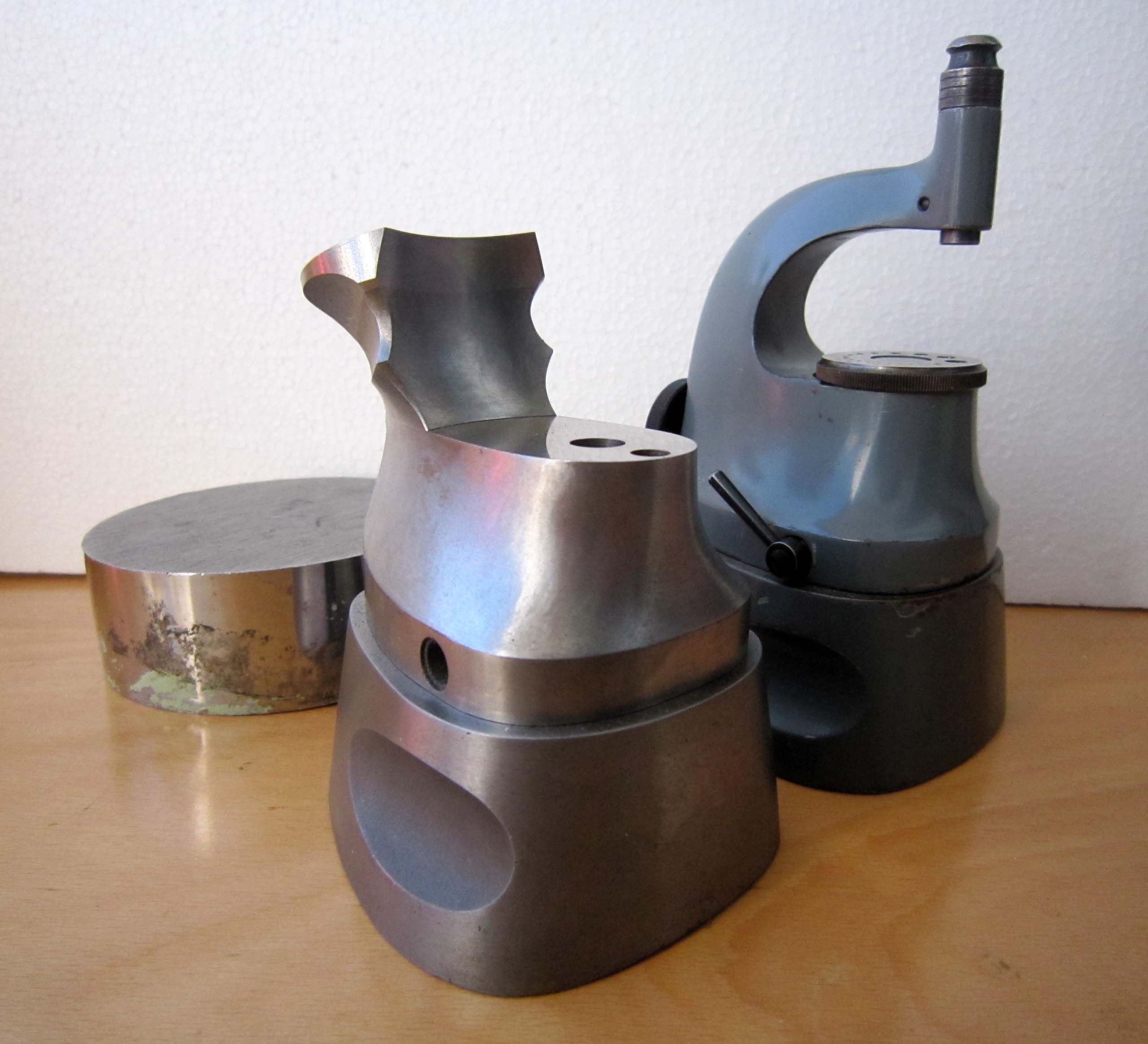 Приспособление для прессования камней представляет собой столик с загибающимся над ним держателем, на котором закреплена ручка для прессования. К прибору прилагается около 60 различных штемпелей и насадок. Прибор изготавливался в Швейцарии в 50-60-х годах.