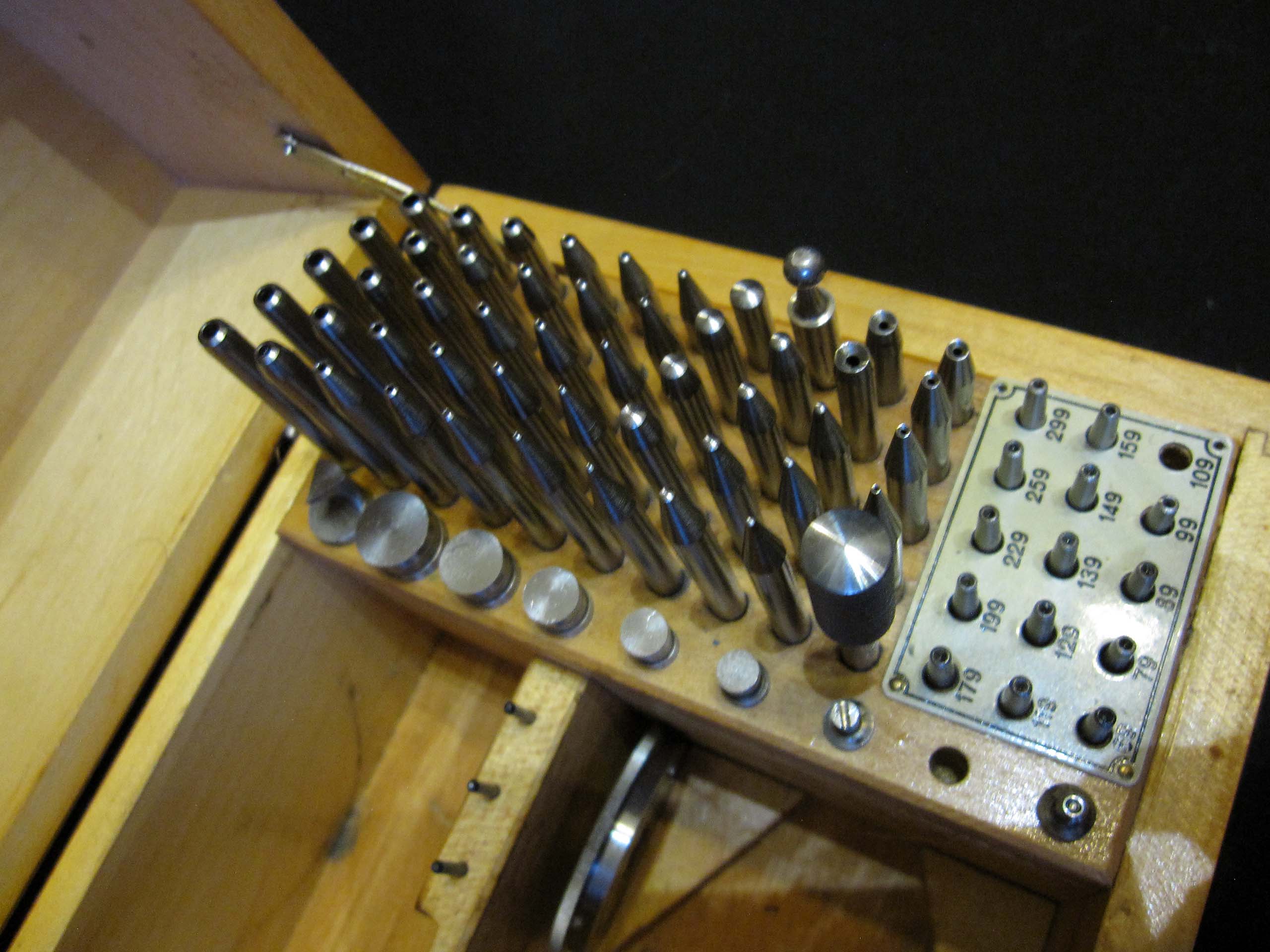 В часовой мастерской есть всевозможные прессовальные приборы с различными функциями, в основе их работы лежит схожий функциональный принцип: внизу находится подставка для заготовки, сверху прессовальный штамп, предназначенный для определённого рабочего шага. Форма и размер вставок и штемпелей почти не отличается, а вот способ крепления штампов у каждого пресса, к сожалению, разный. У приспособлений для прессования камней отверстия в основном имеют диаметр 4 мм., а, например, у потанса пунции имеют диаметр 4,7 мм., поэтому для каждого пресса нужен подходящий набор штемпелей. Самый многочисленный и разнообразный набор пунций у потанса Boley.